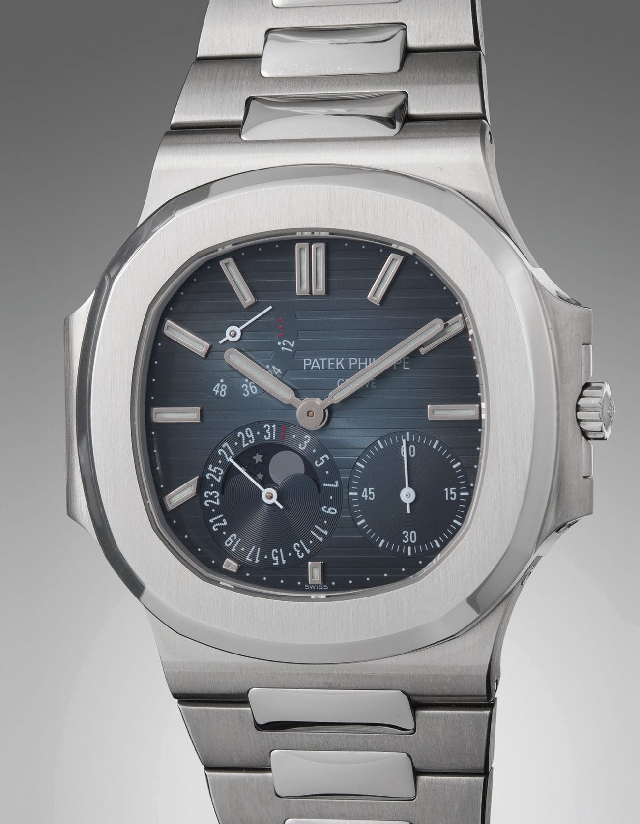 Originally designed by world renowned Gerald Genta, the first of the Nautilus family was presented in 1976. Reference 3712/1A was at the time of its launch, the most complicated version of the Nautilus made by Patek Philippe, which had previously only indicated the date. The letters following the official name of the self-winding caliber 240 – PS IRM C LU – stand for "petite second" (small seconds), "indication de réserve de marche" (power reserve), "calandrier" (date), and "lune" (moon), all of which are present on the 3712 in an idiosyncratic but somehow harmonious arrangement.