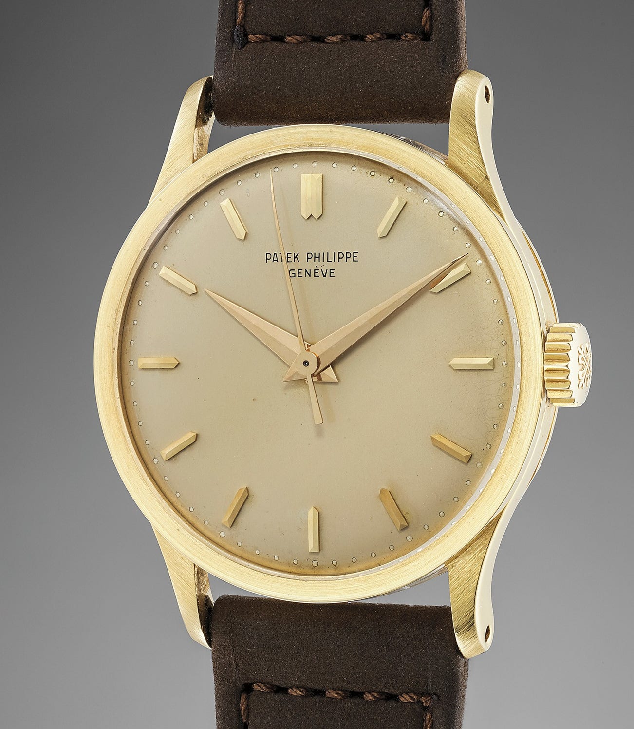 This extremely attractive yellow gold reference 570 is distinguished by its beautiful champagne dial that is further intensified by patina. To date, the market has identified five examples in yellow gold that feature a champagne dial.