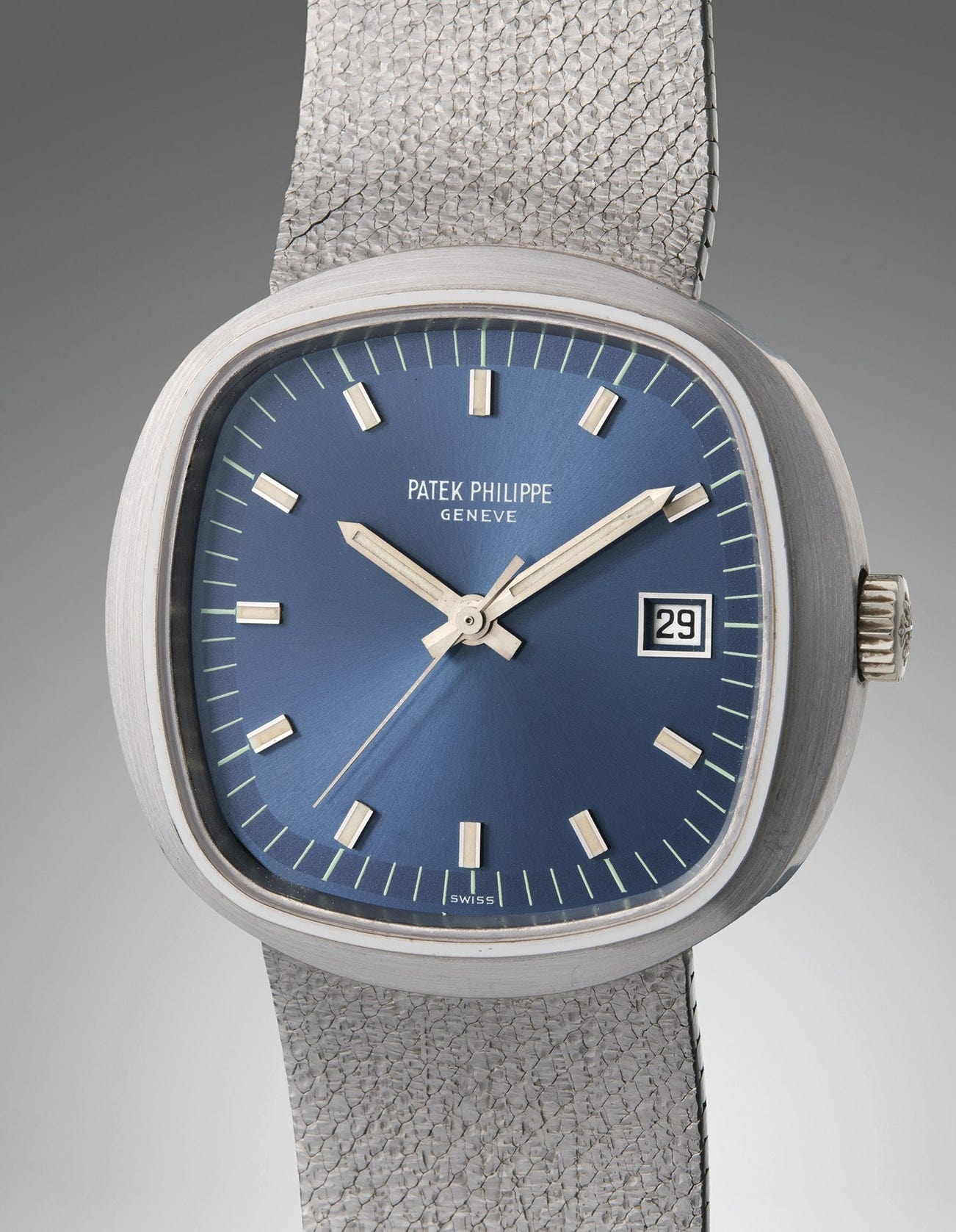 Patek Philippe’s reference 3587/1 was introduced in 1969 at Basel as their first quartz wristwatch. It was the largest diameter, serially-produced wristwatch ever made by Patek Philippe at the time, measuring an impressive 43mm in diameter. The watch is the synthesis of 1970s modernity with an oversized cushion-shaped case and screw-down case back that is opulent and glamorous. The present example with integrated bracelet, weighing almost 200g, is in excellent overall condition with a shimmering blue dial and luminous hour markers and hands that have all aged nicely over time. The 3587/1 is a watch that has a unique place in history, introduced at a time of great change in the world, from politics to fashion, setting out to counter threats to the world of haute horlogerie. With scholarship suggesting only 18 examples of the reference having been produced, it’s an exciting watch for the collector of uncommon timepieces.