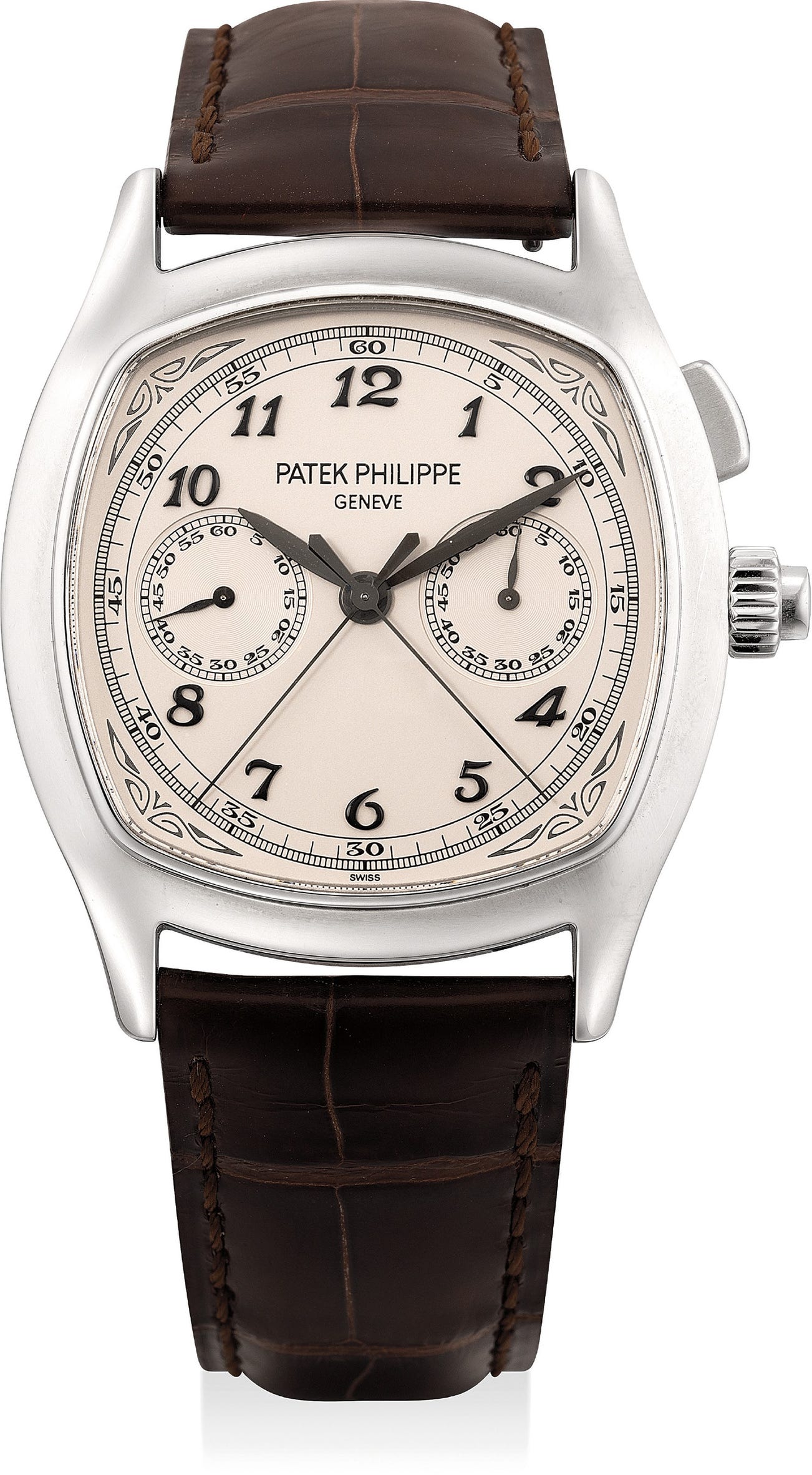 At Baselworld in 2010, Patek Philippe announced the reference 5950, a cushion-form, single button split-seconds chronograph with the same in-house movement but boasting subtle Belle Epoque styling. Patek Philippe launched the reference with a larger case made of stainless steel – an unusual and most appreciated decision since the vast majority of Patek Philippe’s complicated timepieces are housed in cases made of precious metals. An “application piece” reserved for the brand’s best clients, the steel reference 5950 further impressed collectors with its raised, applied black gold Breguet numerals, black lacquer scroll detailing at the corners and on the buckle, and its lustrous opaline dial. The direct inspiration for the reference 5950 can be found in the archives of the Patek Philippe Museum, with a similar single-button split-seconds chronograph cased in 18K yellow gold and bearing similar scroll details on the dial.