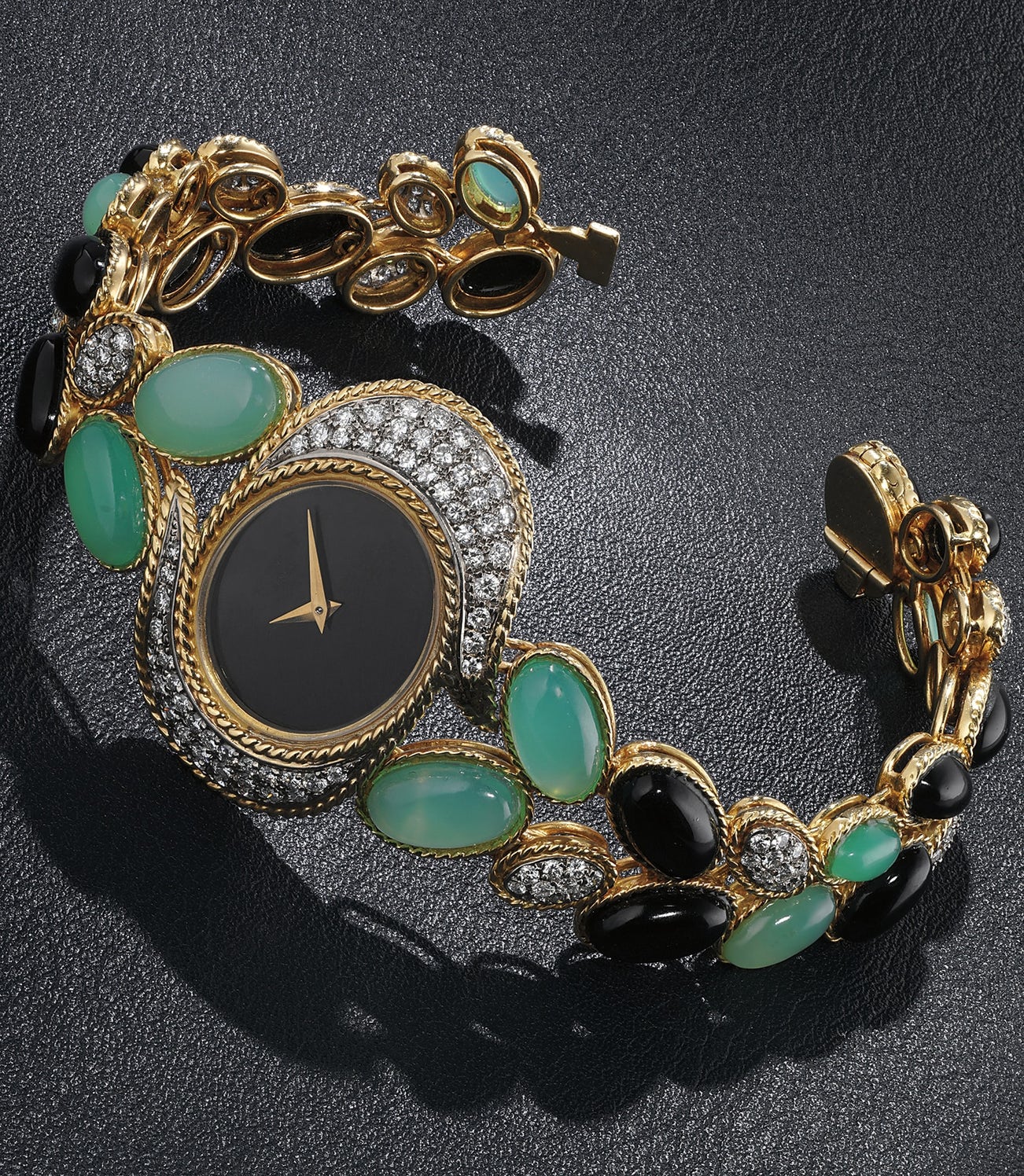 An exquisite, elegant and attractive yellow gold, onyx, diamond and chrysoprase-set bracelet watch, from the collection of Catherine Deneuve