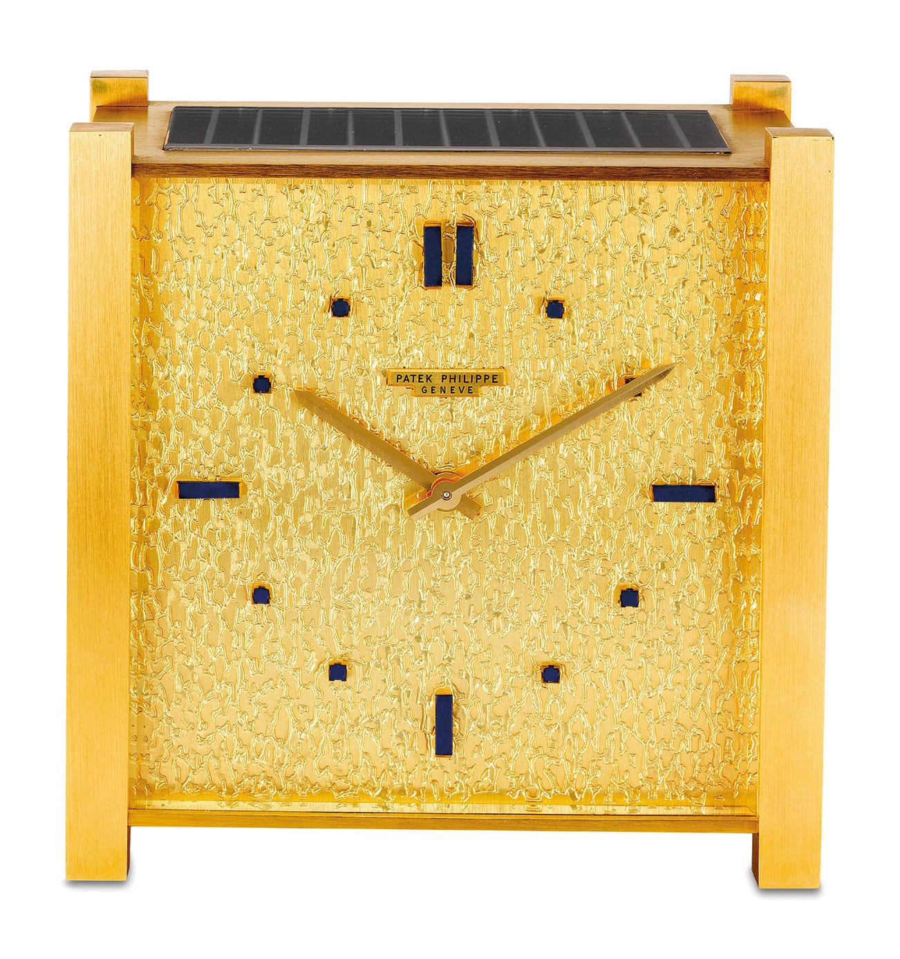 A rare, attractive and unusual gilt brass and lapis lazuli desk clock with "Rock" engraved dial