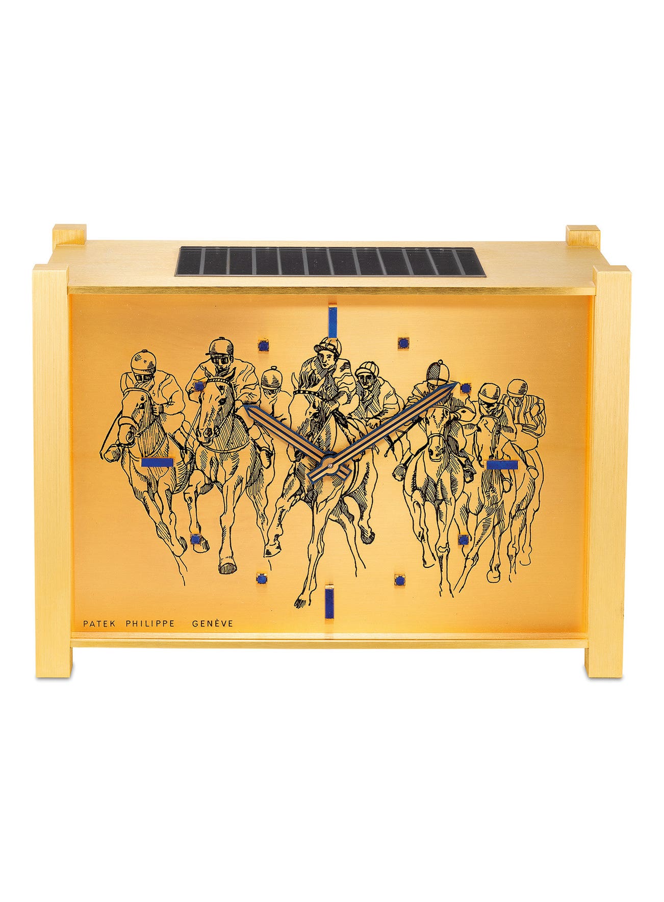 A rare, attractive and unusual gilt brass, wood and lapis lazuli desk clock with "Horse Scene" engraved dial