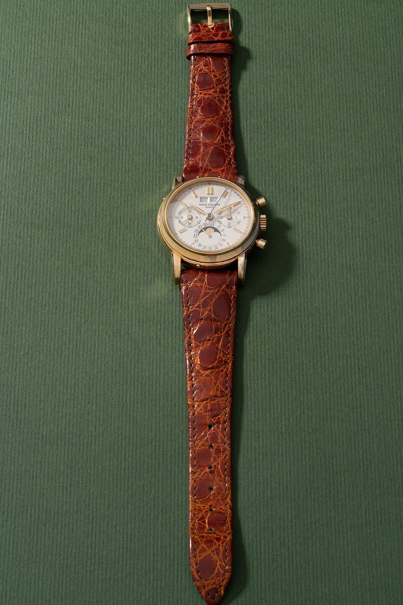 A fine and very rare yellow gold perpetual calendar chronograph wristwatch with moon phases, 24 hours, leap year indicator, transparent sapphire case back, original certificate, setting pin and presentation box
