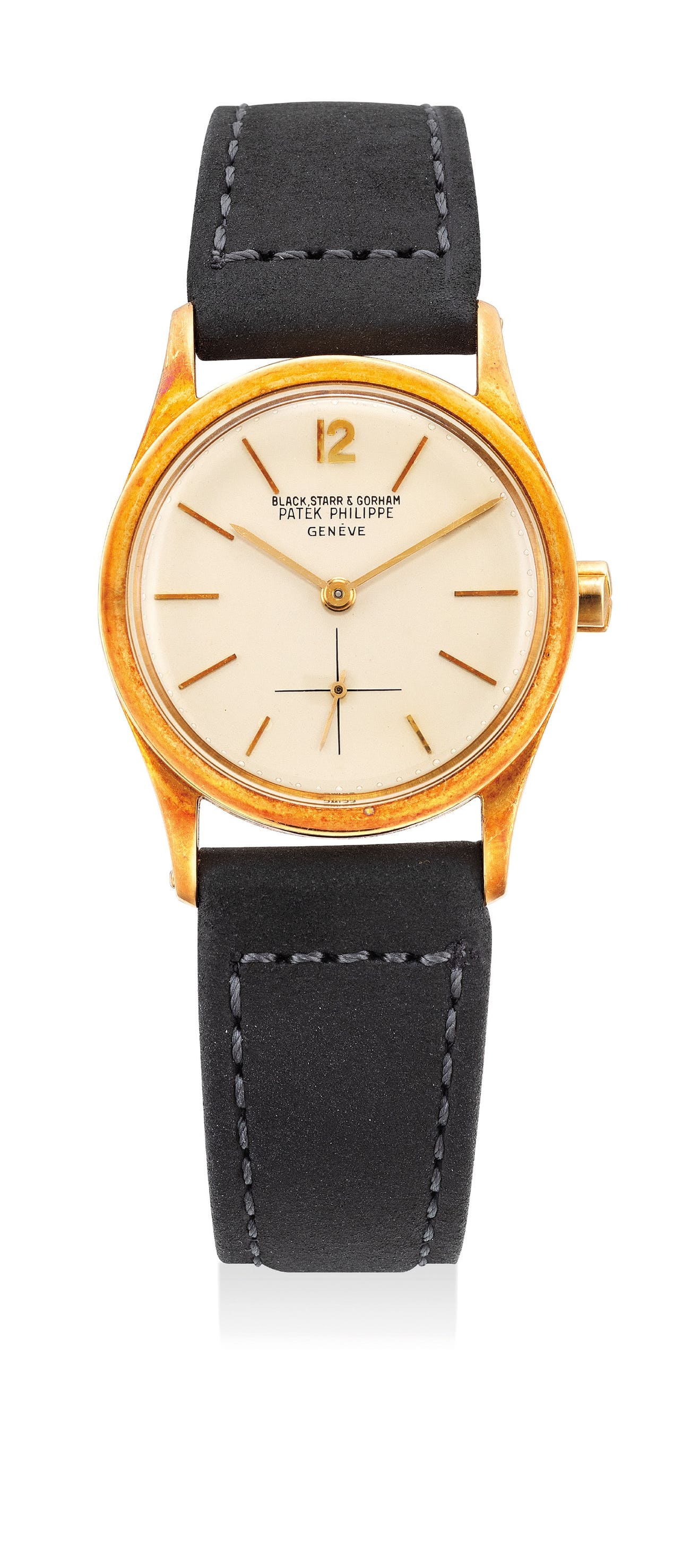 The hallmarks are crisp and a possible hand etched retailer inventory number on the underside of the bottom right lug remains crisp. From the early production, the watch features the PP crown, which on later examples used the new Calatrava crown. The watch is made more unique with the rare retailer signature, Black, Starr & Gorham, and is only the third known example to appear at auction with the signature.