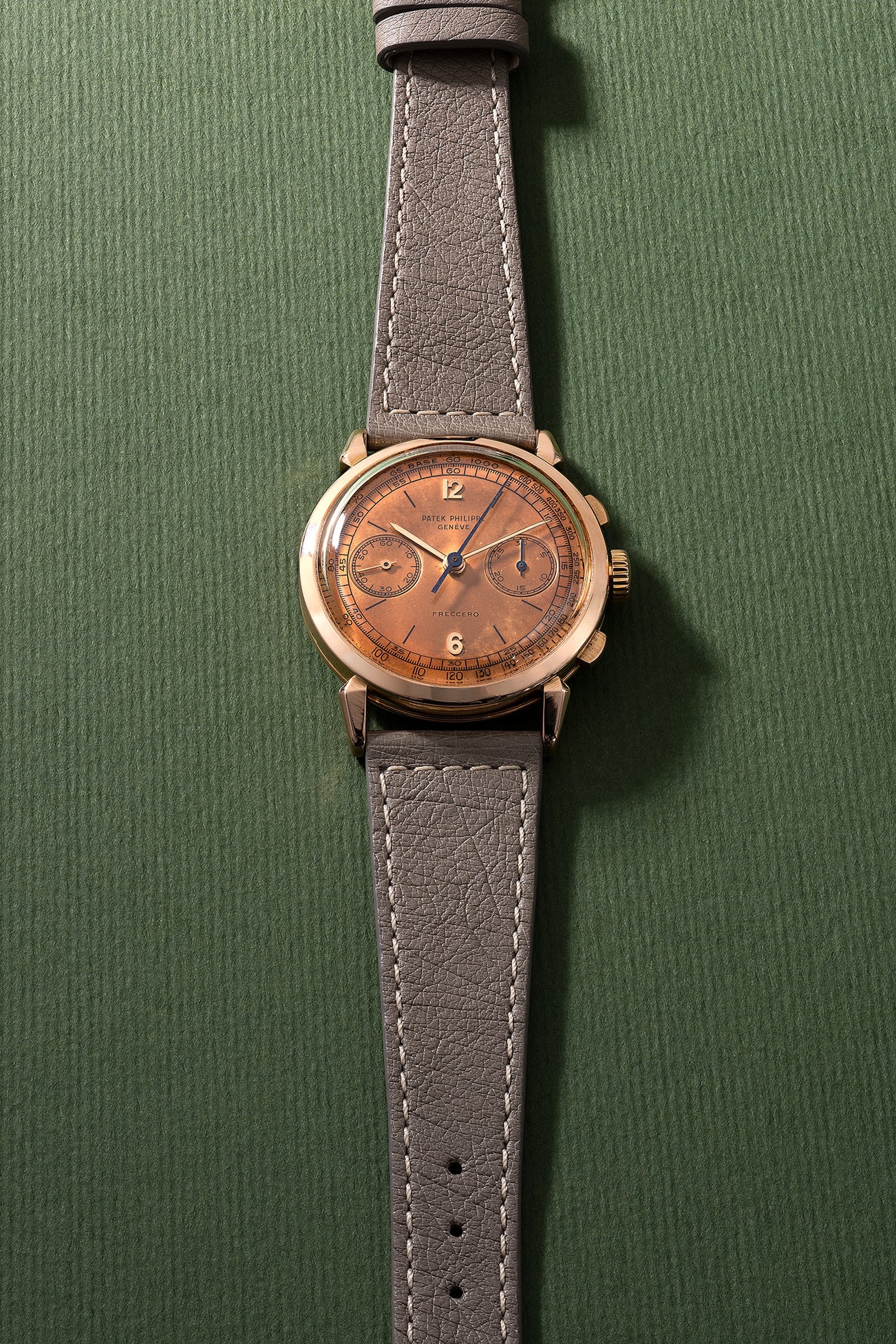 The dial configuration of the present watch belongs to the second series created by the manufacturer, and is a Mark 1 of such series as its railway track is not complete. Only seven examples of reference 1579 in pink gold, including the present lot, have appeared to the market with the Freccero signature on the dial. Among these extremely rare pieces, only two of them have enamel indexes and this watch is the only known piece to come with its box and original certificate. The case retains its elegant angles, and has wondrously oxidized with an awe-inspiring layer of natural patina, not unlike a majestic testimony of time.