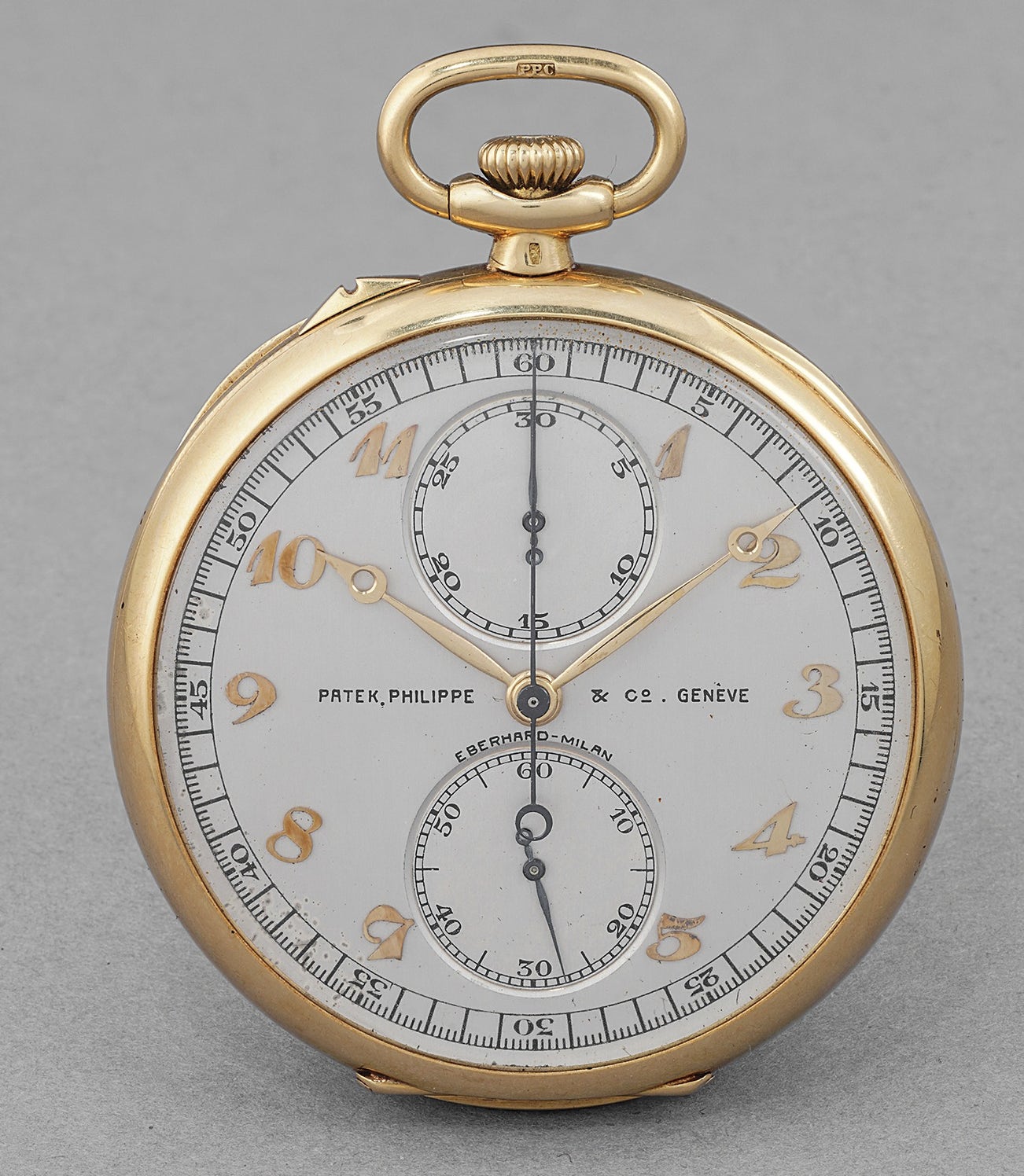 A rare and exceedingly well-preserved yellow gold chronograph openface watch with vertical registers, Breguet numerals, original certificate and presentation box, retailed by Eberhard Milan