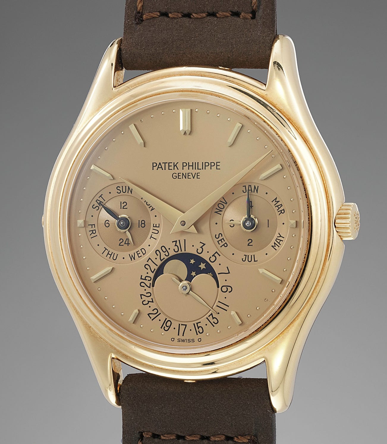 An exceedingly rare and incredibly attractive yellow gold perpetual calendar wristwatch with champagne dial and moonphases