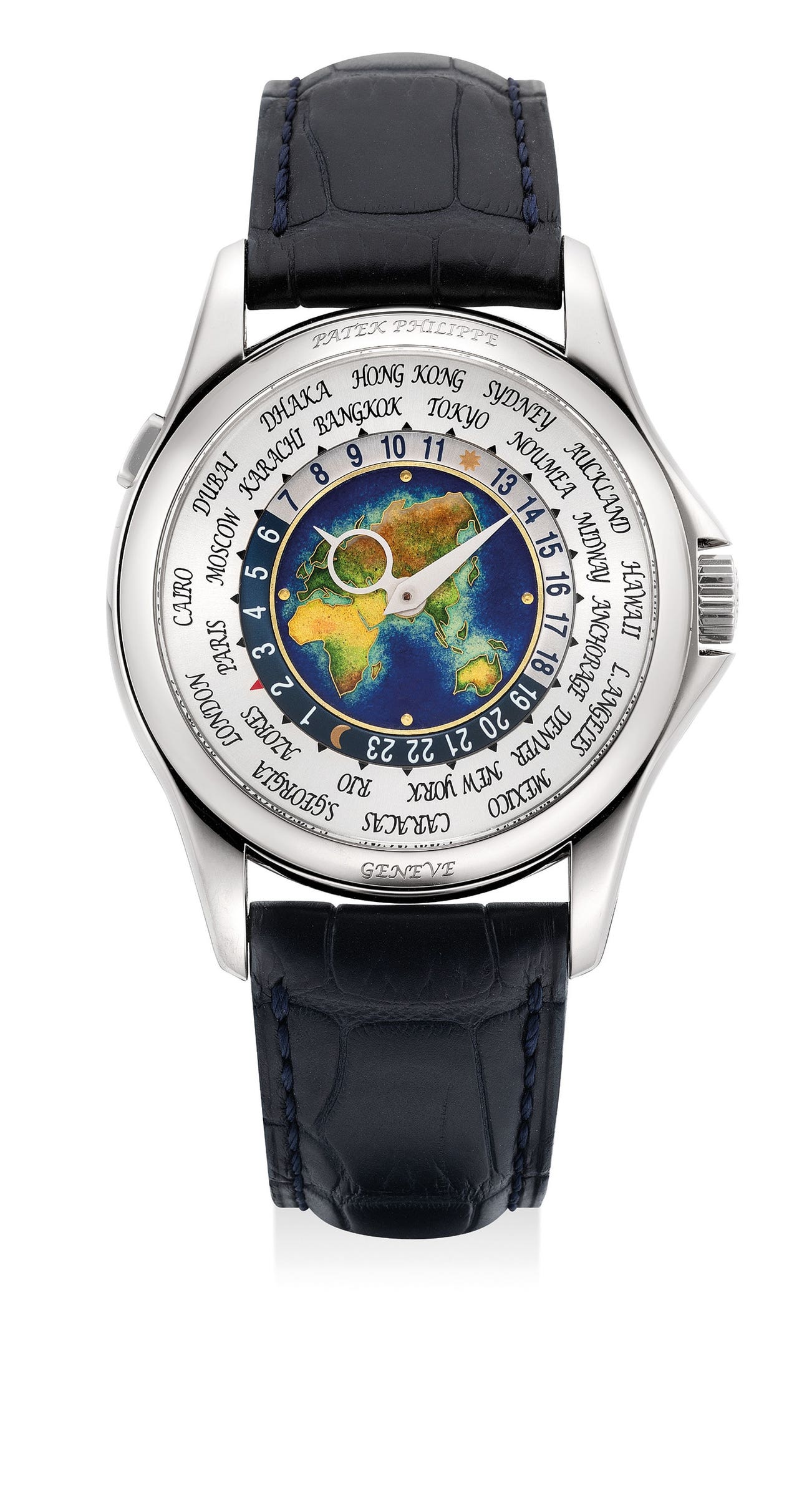 The Patek Philippe world-time wristwatches have always been sought after by collectors from the boutiques with a scarce amount of supply. The combination of the exquisitely crafted cloisonné enamel dial and the practicality of the world-time complication is what attracts the most esteemed collectors of Patek Philippe wristwatches. The present example in white gold is further presented with the original Certificate of Origin stamped Patek Philippe Salons de Genève and its original fitted presentation box.