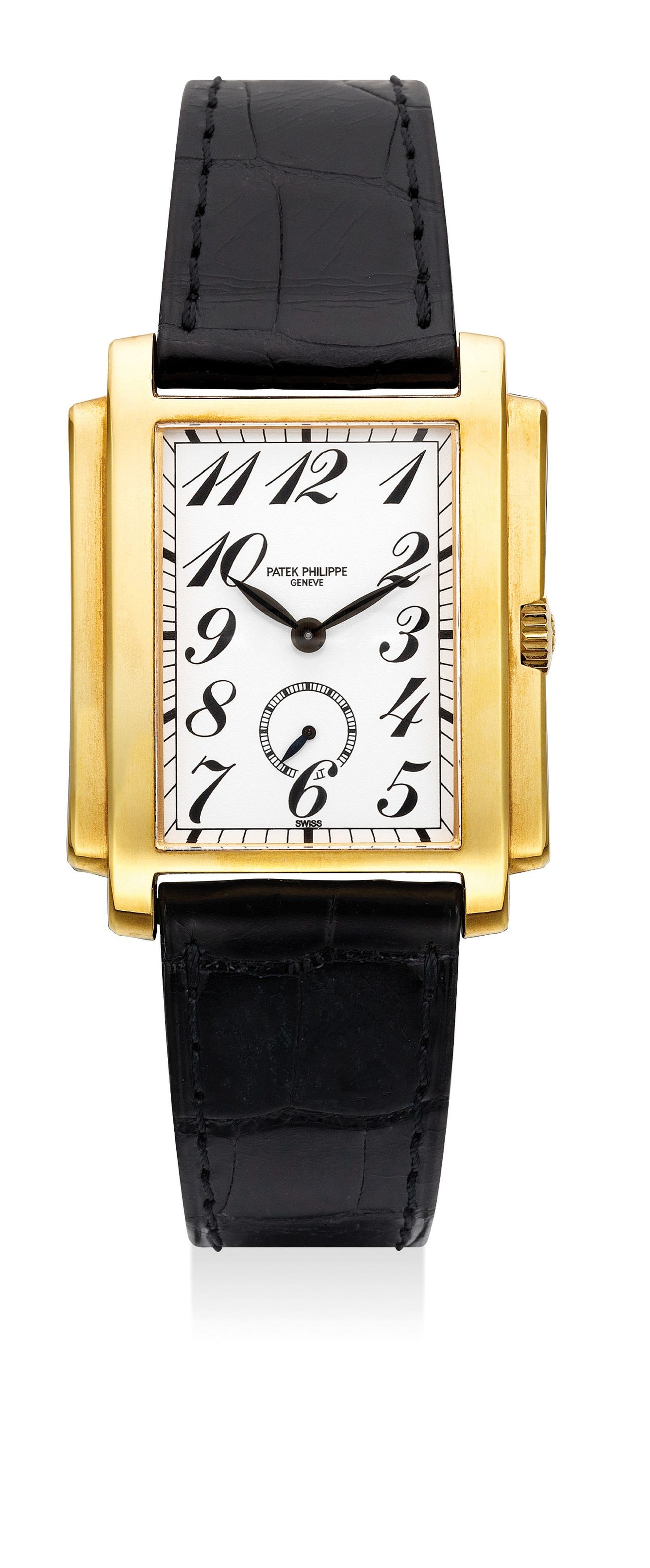 A fine yellow gold rectangular-shaped wristwatch with white porcelain dial with Breguet numerals and outer railway minute track, with presentation box