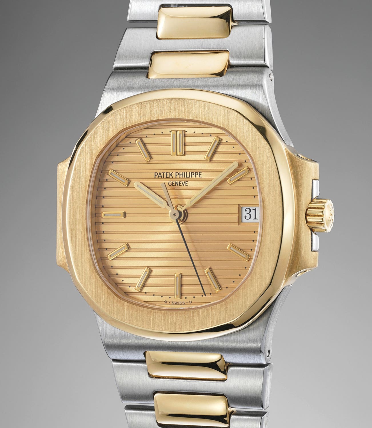 This attractive and exceedingly well-preserved stainless steel and yellow gold example displays a champagne dial, which is confirmed by both the Certificate of Origin and Extract from the Archives. It is preserved in excellent condition with crisp bevels and sharp edges throughout. It is furthermore replete with its original accessories such as the Certificate of Origin stamped by the retailer Carlson Watch Co. in Hong Kong, service documents from Patek Philippe Japan, leather wallet and fitted presentation box.