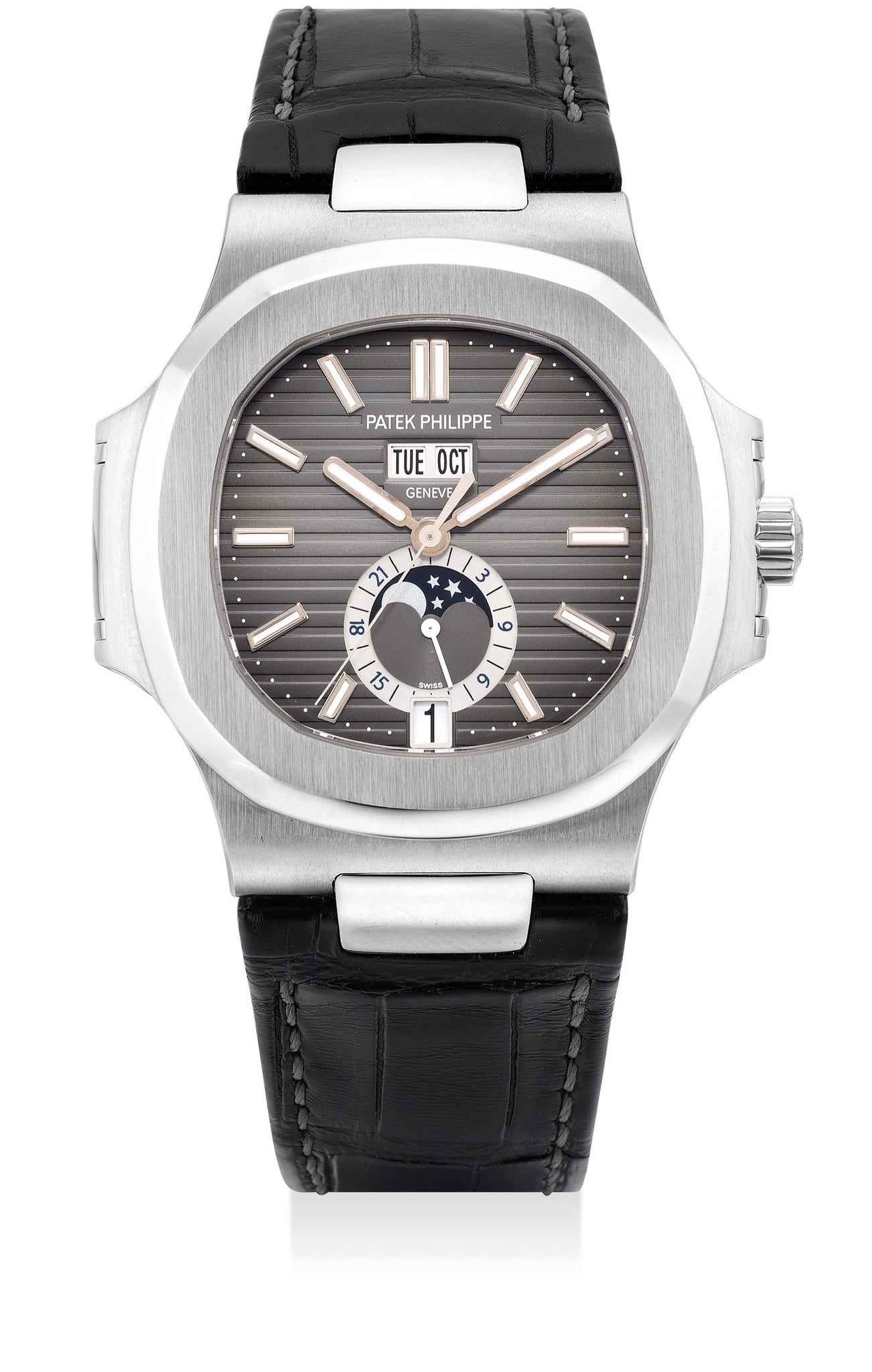 The reference 5726A was released in 2010 in stainless steel with a leather strap, and upgraded in 2012 to include a stainless steel bracelet and new light silver dial. Patek Philippe’s Nautilus model is a favourite in the collecting community with its Jules Verne Twenty Thousand Leagues Under the Sea inspired case by Gerald Genta. Introduced in 1976 as a luxury sports wristwatch it has been updated over the last 40 years and includes models from time only gold examples, to chronograph models. Still available today, the reference 5726A is a sporty watch, which is complimentary in any setting from a weekend at the beach, to negotiations in the boardroom. The present example is at auction for the first time and is in excellent overall condition with original factory finish.