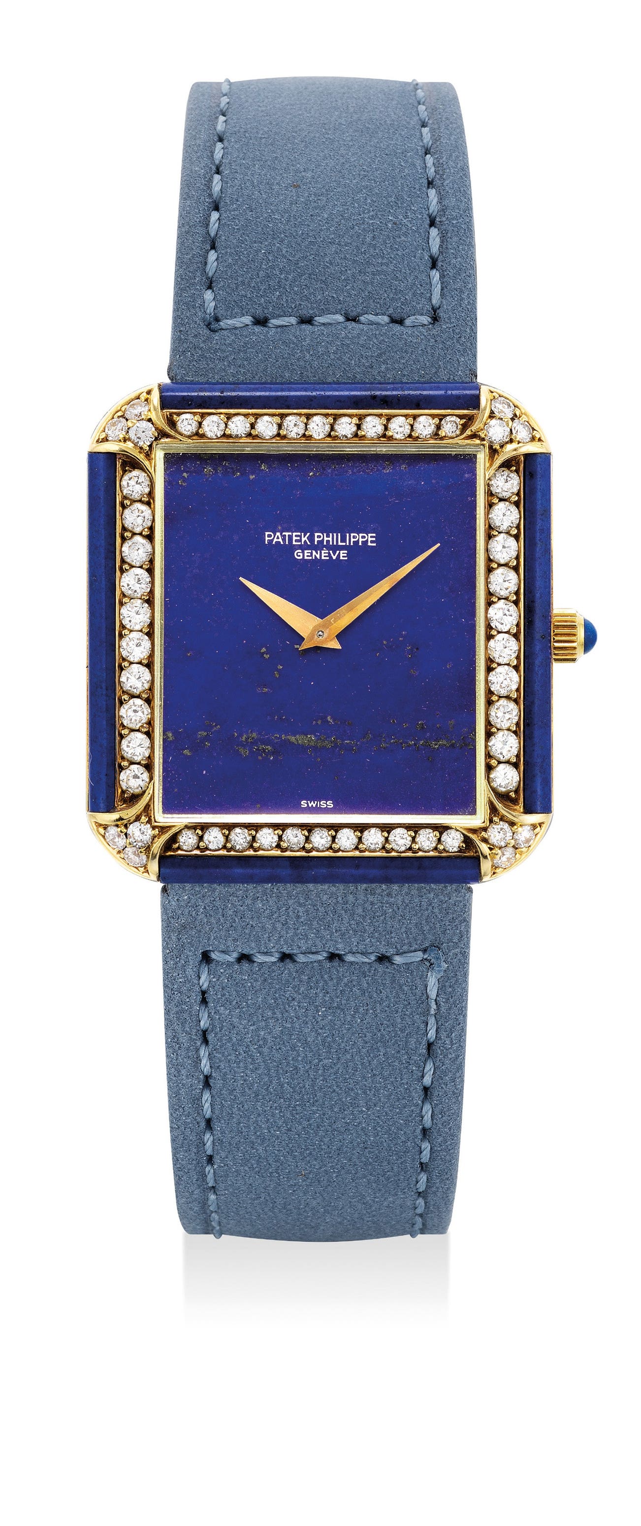 The present example is a lovely and impressive 18K yellow gold, lapis lazuli and diamond-set wristwatch by Patek Philippe from the late 1970’s.