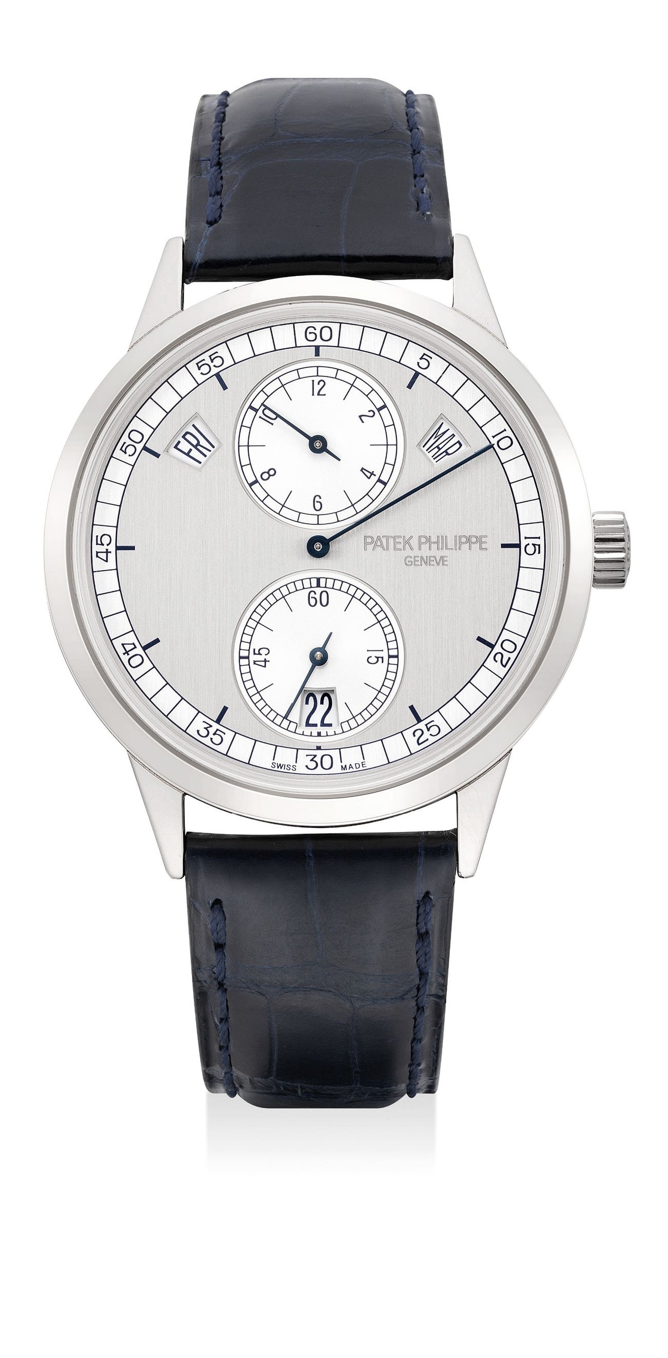 The present example in white gold is no longer in production as it is replaced with a pink gold version. Adding to its attraction, the present excellent example is further accompanied by the full set of accessories。
