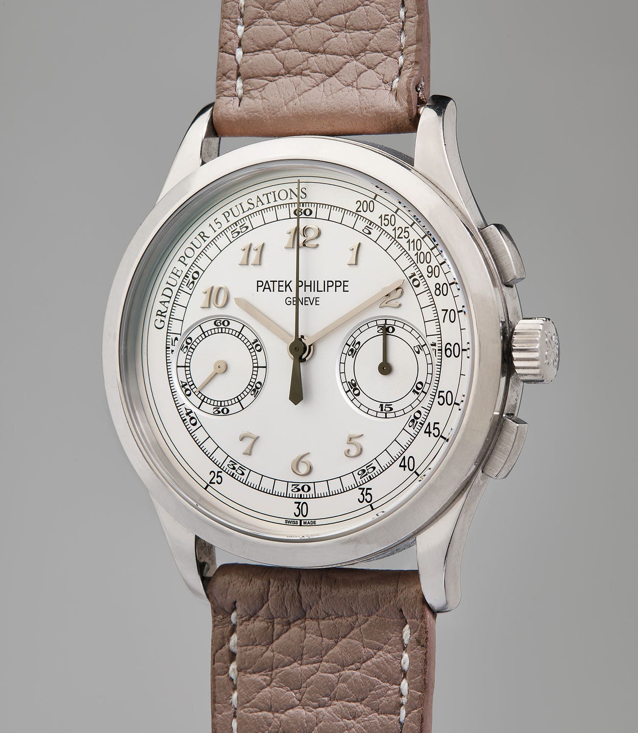 The white gold version of the reference 5170 was introduced in 2013, with the distinctions of having a dial with applied Breguet hour markers and pulsometer scale. With a slim yet sizable case profile, the 5170 is highly discreet and wearable - a perfect watch for the office, board meeting, or for weekend wear. Stamped with the Patek Philippe Seal, the caliber CH 29-535 PS winds smoothly and beautifully, and the chronograph buttons have extremely satisfying haptics. The present example is offered in excellent condition from its original owner, with all of its original accessories.