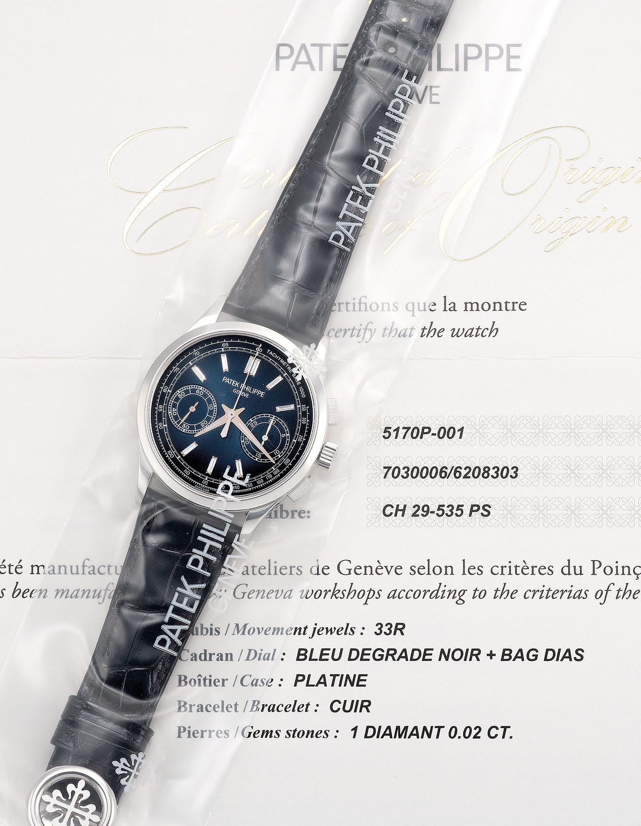 The present example of a Patek Philippe ref. 5170P is offered in unworn single sealed condition and is further accompanied by the complete set of accessories that came with the watch when it was purchased by the original owner from Japan.