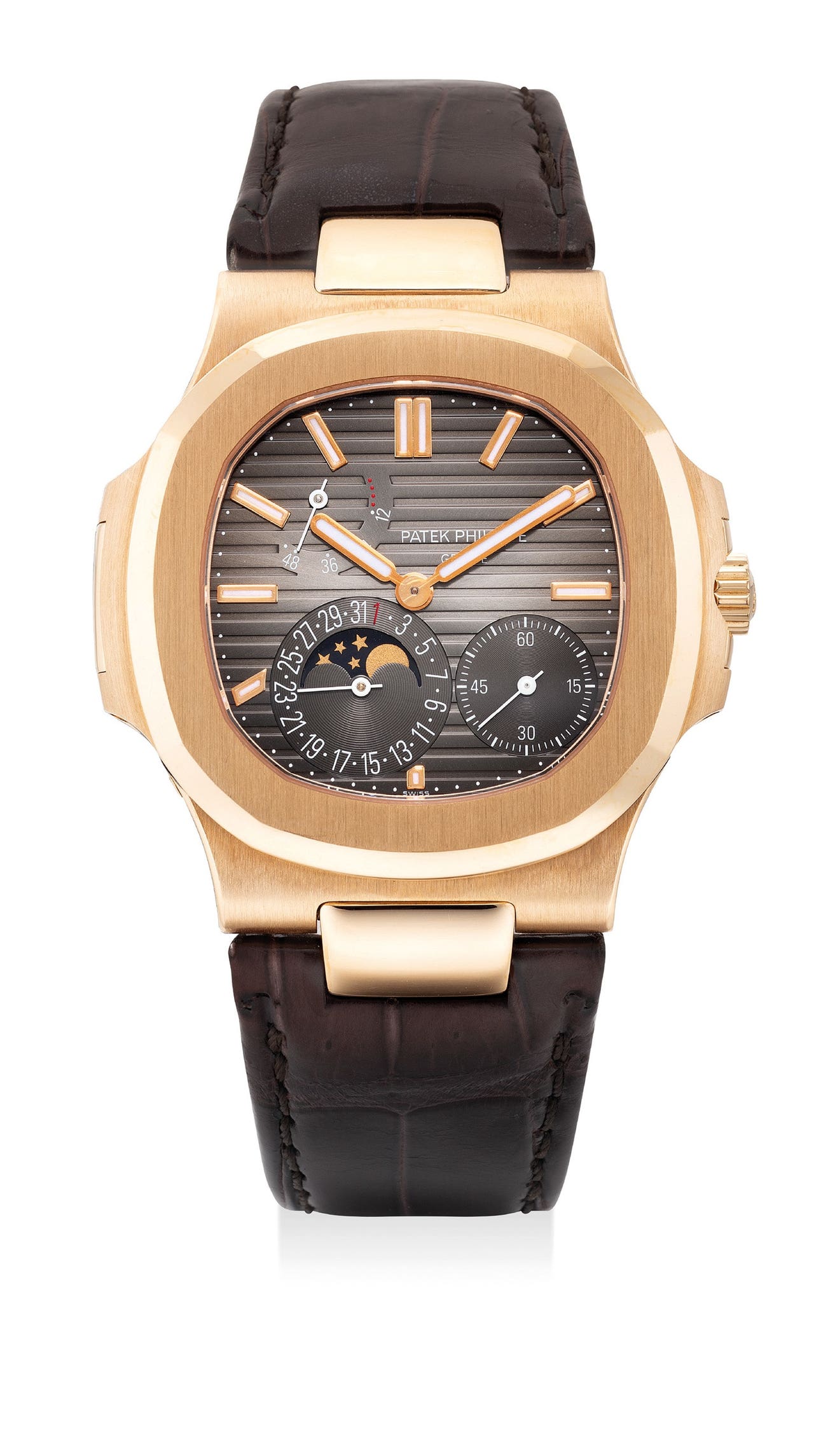 The present example of a Patek Philippe Nautilus ref. 5712 in pink gold fitted with a crocodile strap is offered in excellent overall condition and is a fantastic opportunity to acquire a discontinued model complete with the original Patek Philippe Certificate of Origin.