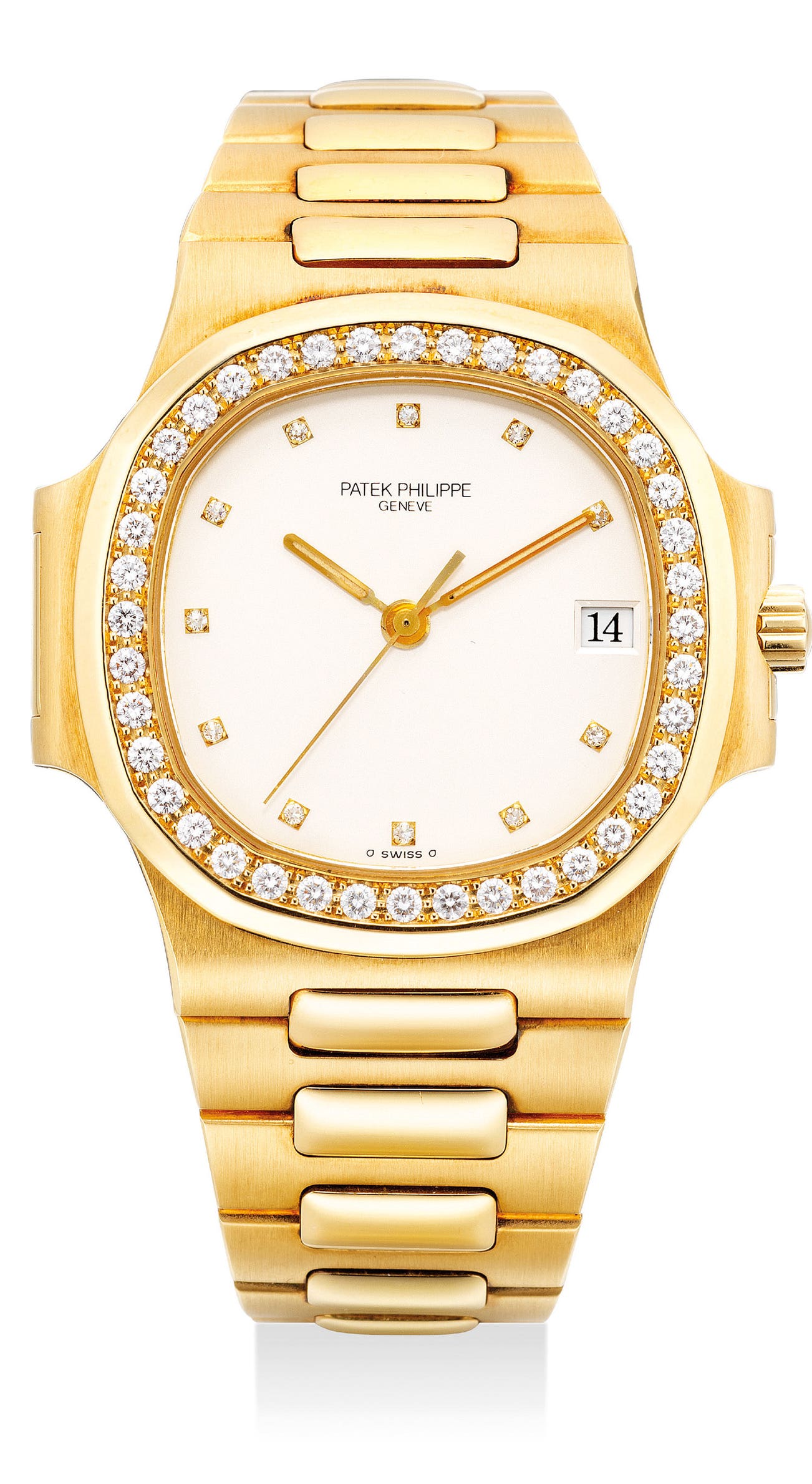 A very fine and attractive yellow gold and diamond-set wristwatch with sweep center seconds, white “ceramic” dial, date, bracelet, certificate of origin and presentation box