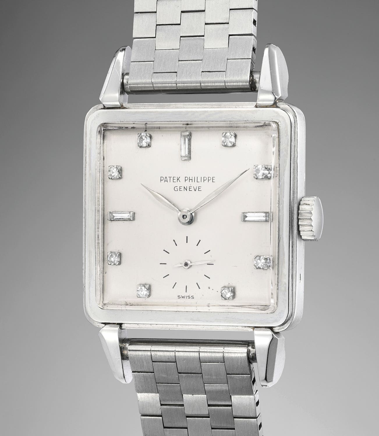 An extremely rare and attractive platinum and diamond-set wristwatch with spider lugs, bracelet, certificate of origin, original invoice and presentation box