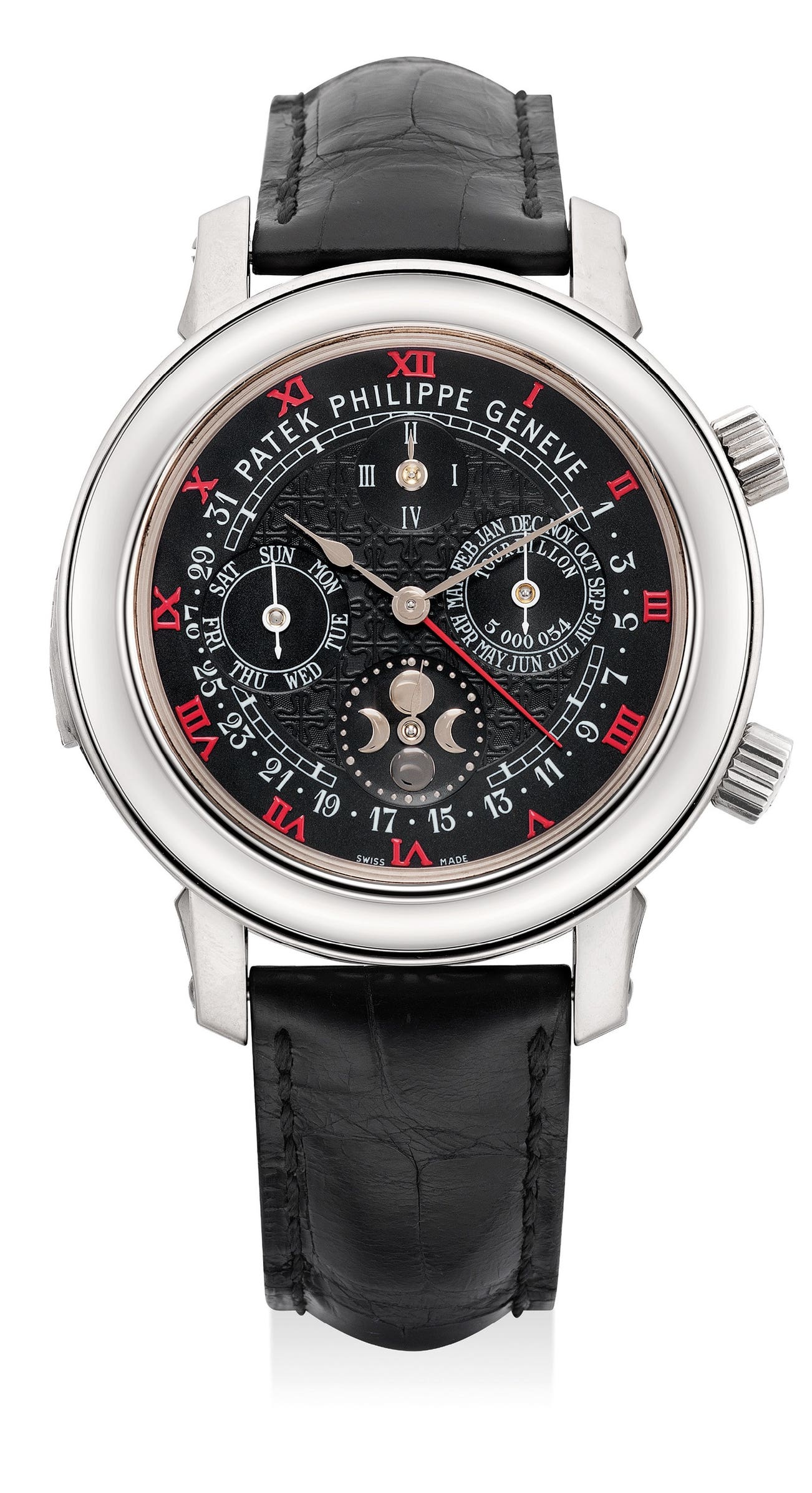 While any Sky & Moon Tourbillon, disregarding case material or dial layout, is an absolute masterpiece and the stuff horological dreams are made of, the present example unarguably surpasses in looks and collectability its peers, as it features a special request, never-before-seen dial. While what is normally found on platinum 5002 is a white or black dial with applied Roman numerals, the present piece features a so-far unique configuration with red painted Roman numerals. Accurate research failed to identify a similar example, the closest iteration being a platinum specimen featuring red date but maintaining the applied numerals. Another example of similarly styled dial comes from a specimen of reference 5016 featuring red graphics, but again maintaining the applied hour markers.