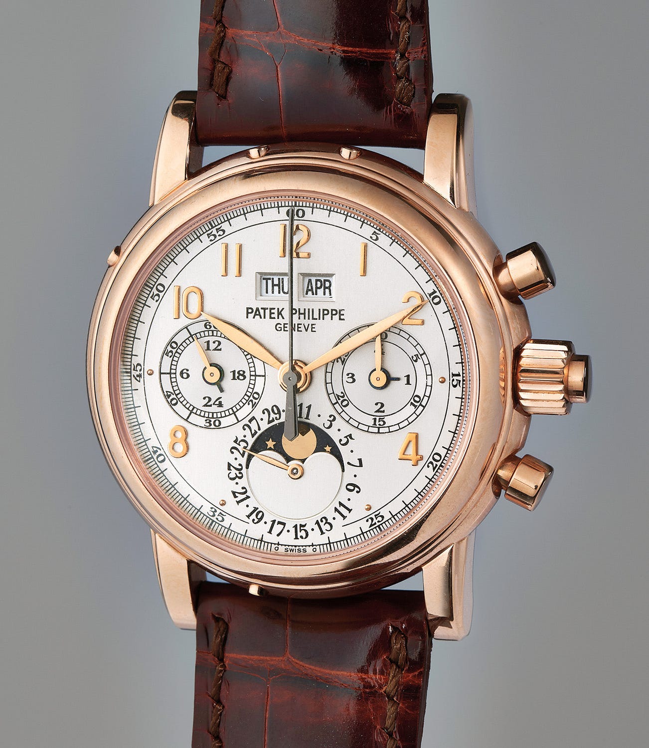 Out of the four serially produced materials used in the 5004 – being yellow gold, white gold, pink gold, and platinum – pink gold appears to be one of the rarest, with total production estimated at around 200 examples. The present example is well-preserved and complete, accompanied by its original certificate of origin and additional solid case back. The model today is discontinued, however, it has achieved cult status amongst Patek Philippe purists as it perfectly combines the brand’s signature design, highest level of complications, and an uncompromising approach to quality.