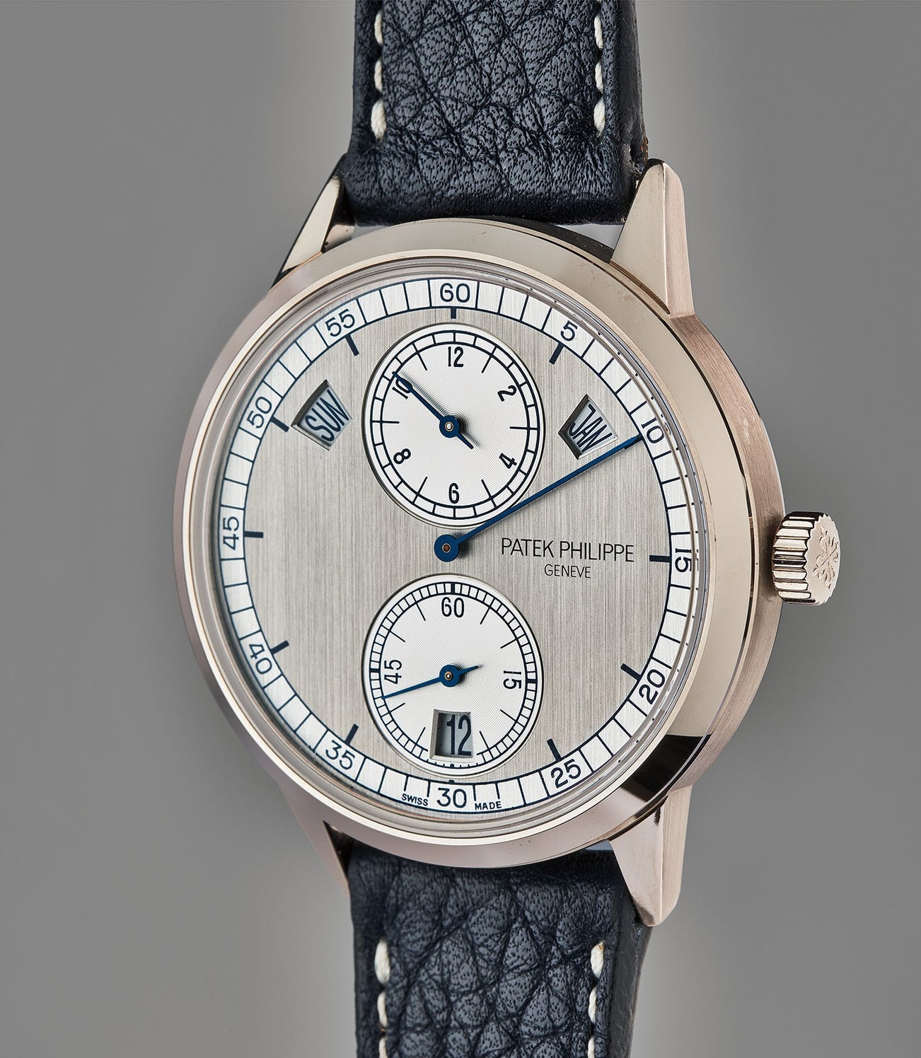 Visually, the watch is quite striking, and a departure from the brand’s product line, though not losing any of the elegance and symmetry the maison is known for. The angular case immediately calls to mind the historic perpetual calendar references 3448 and 3450, with sharply faceted lugs and a flat, tapered bezel. The case and spacious dial are exemplary in their contrasting finishes: the main, darker grey dial is vertically brushed, while the silver outer track has a diagonal brushing. The mirror polished bezel is set against the brushed sides of the case and lugs. Horological journalist Su Jiaxian called the 5235 the “most interesting modern Patek Philippe” in a 2018 article, and cited that it is one of Patek Philippe President Thierry Stern’s favorite offerings.