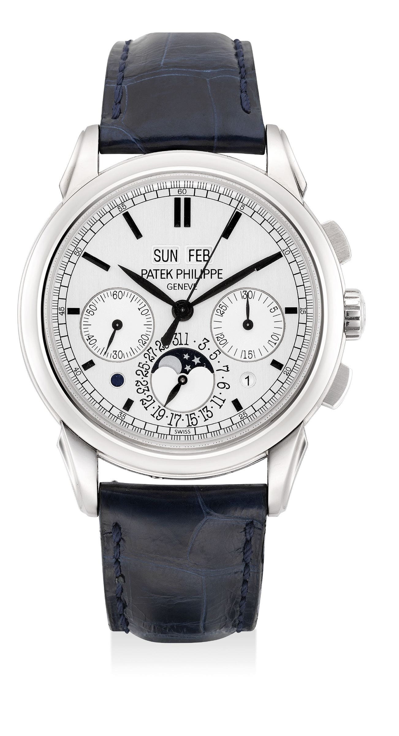 A very fine and attractive white gold perpetual calendar chronograph wristwatch with moon phases, leap year indication, day and night indication, Certificate of Origin and presentation box