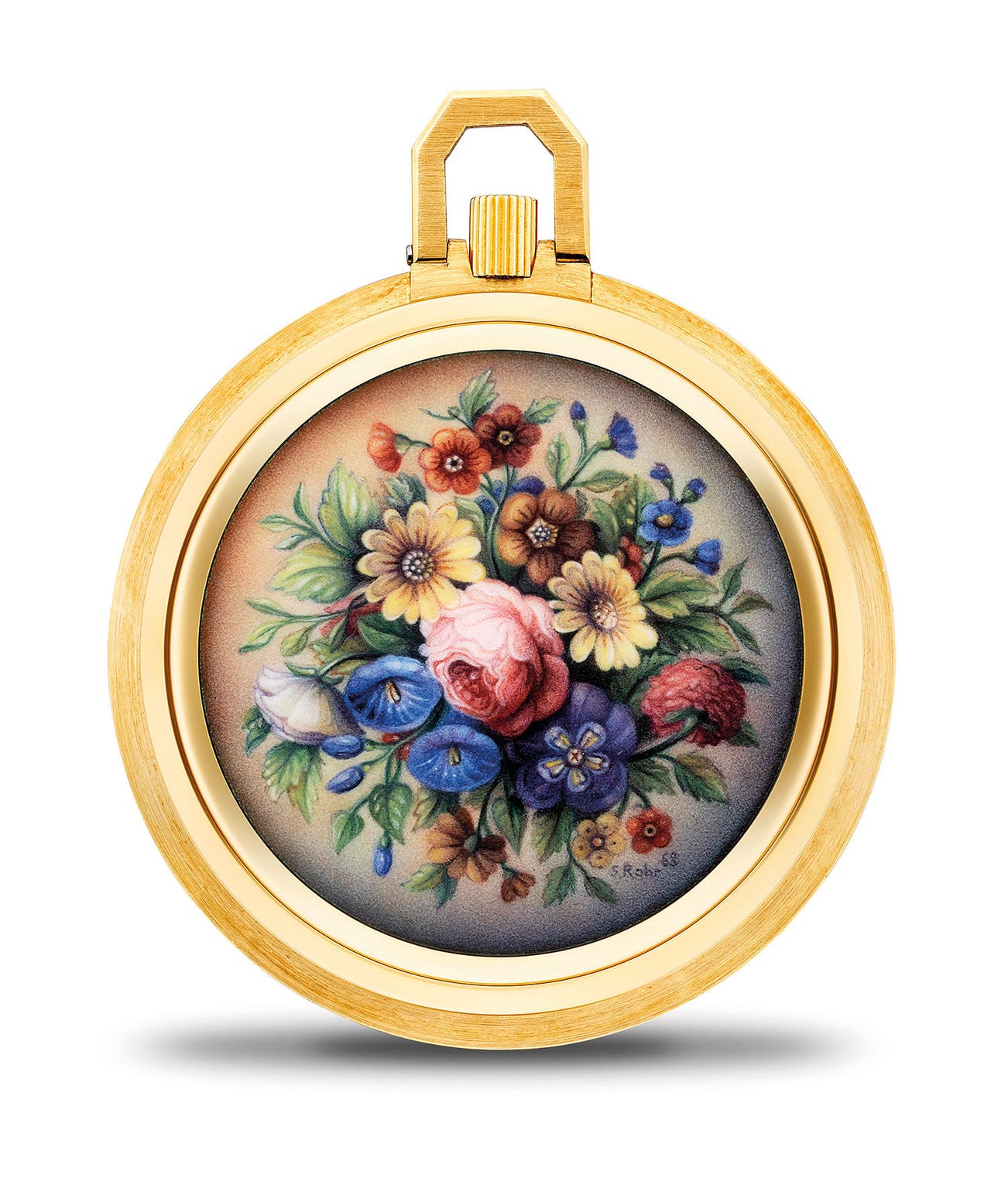 A probably earliest known, extremely fine, and unique yellow gold openface miniature pocket watch with enamelled “Bouquet of Flowers” signed by Suzanne Rohr, retailed by Gubelin and Certificate of Origin