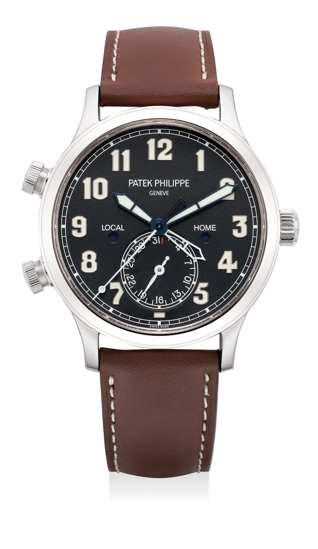 The present watch featuring a dark navy blue matte dial with oversized luminous numerals are ideal features of a pilot’s wristwatch for enhanced legibility. The case features an additional two crowns for the adjustment of local and home time. Furthermore, the subsidiary dial on the 6 O’clock position indicates the date.