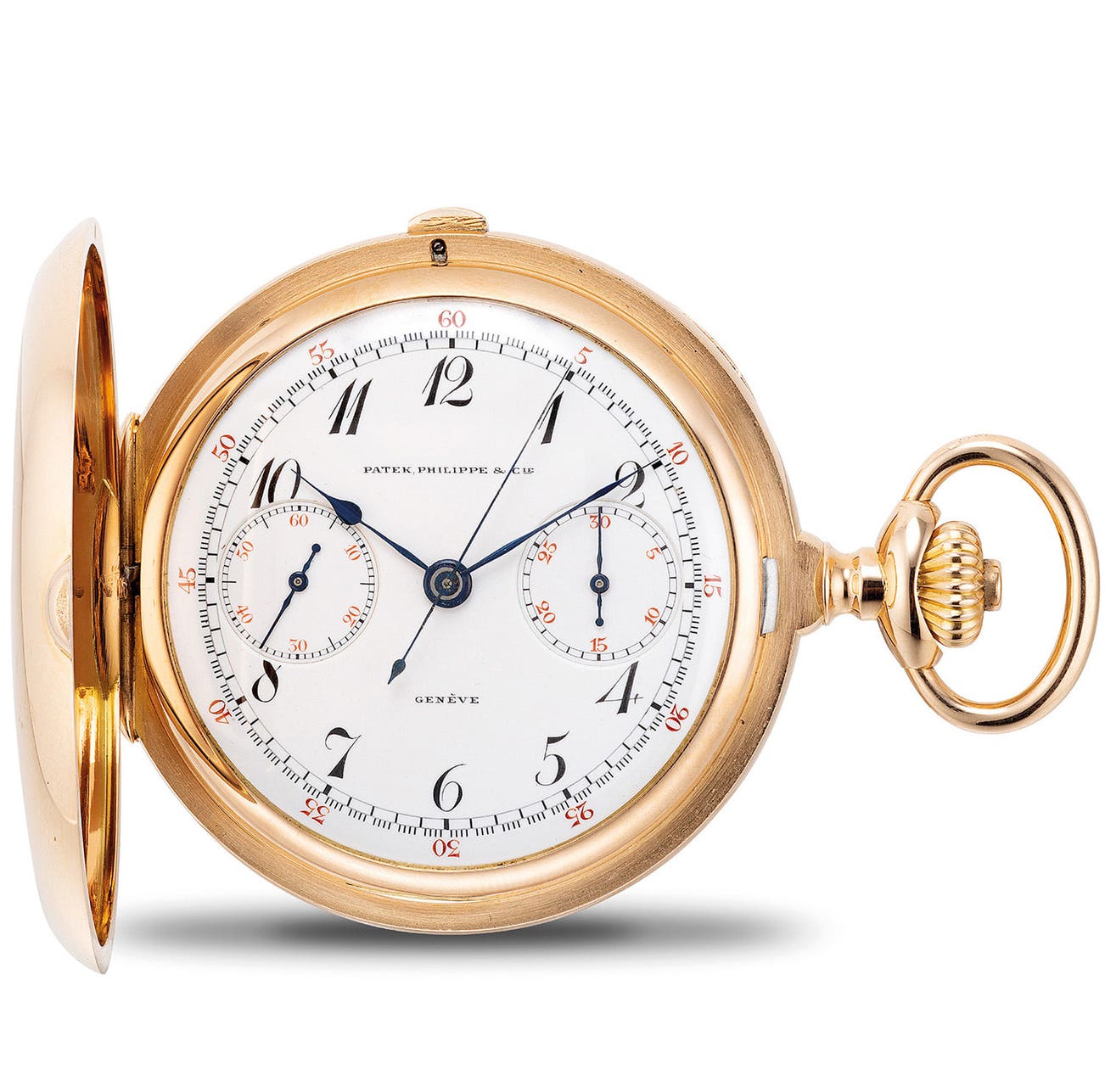 A very fine and well preserved pink gold hunter case single-button chronograph pocket watch with enamel dial, Breguet numerals, Certificate of Origin and presentation box