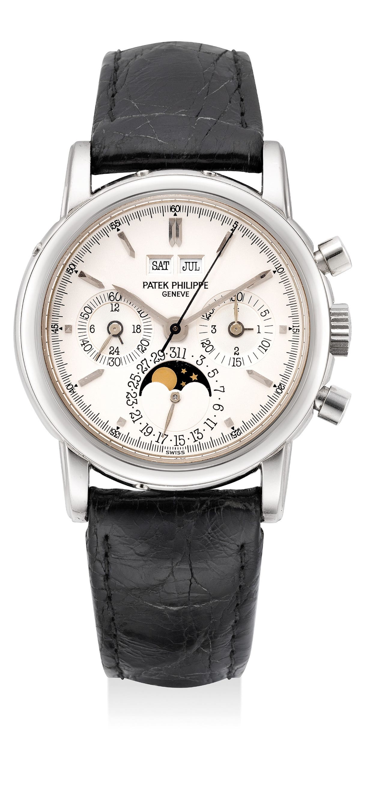 An fine and extremely rare transitional white gold perpetual calendar chronograph wristwatch with moonphases, 24-hour indication, second case back and presentation box