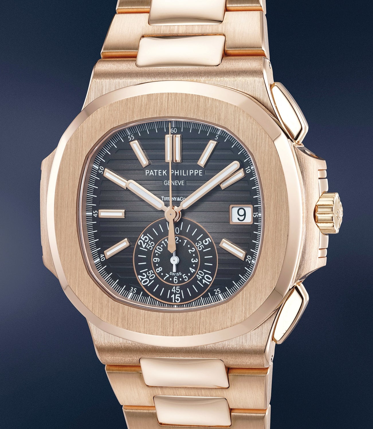 A spectacular, massive and extremely rare pink gold automatic chronograph wristwatch with date, bracelet and Certificate retailed by Tiffany & Co.