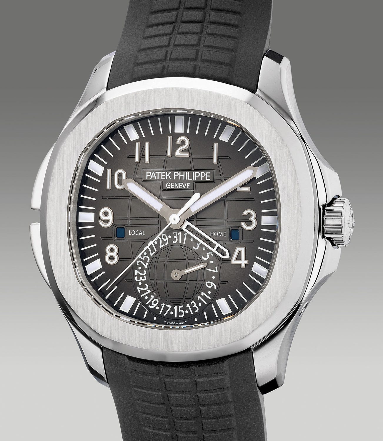 The present example Patek Philippe ref. 5164 Travel Time in stainless steel is offered in absolute “like new” overall condition with no signs of use and wear and is further accompanied by its original Certificate of Origin, setting pin, hang tag and its presentation box. Adding to its attraction, the original rubber strap is well-preserved and uncut.