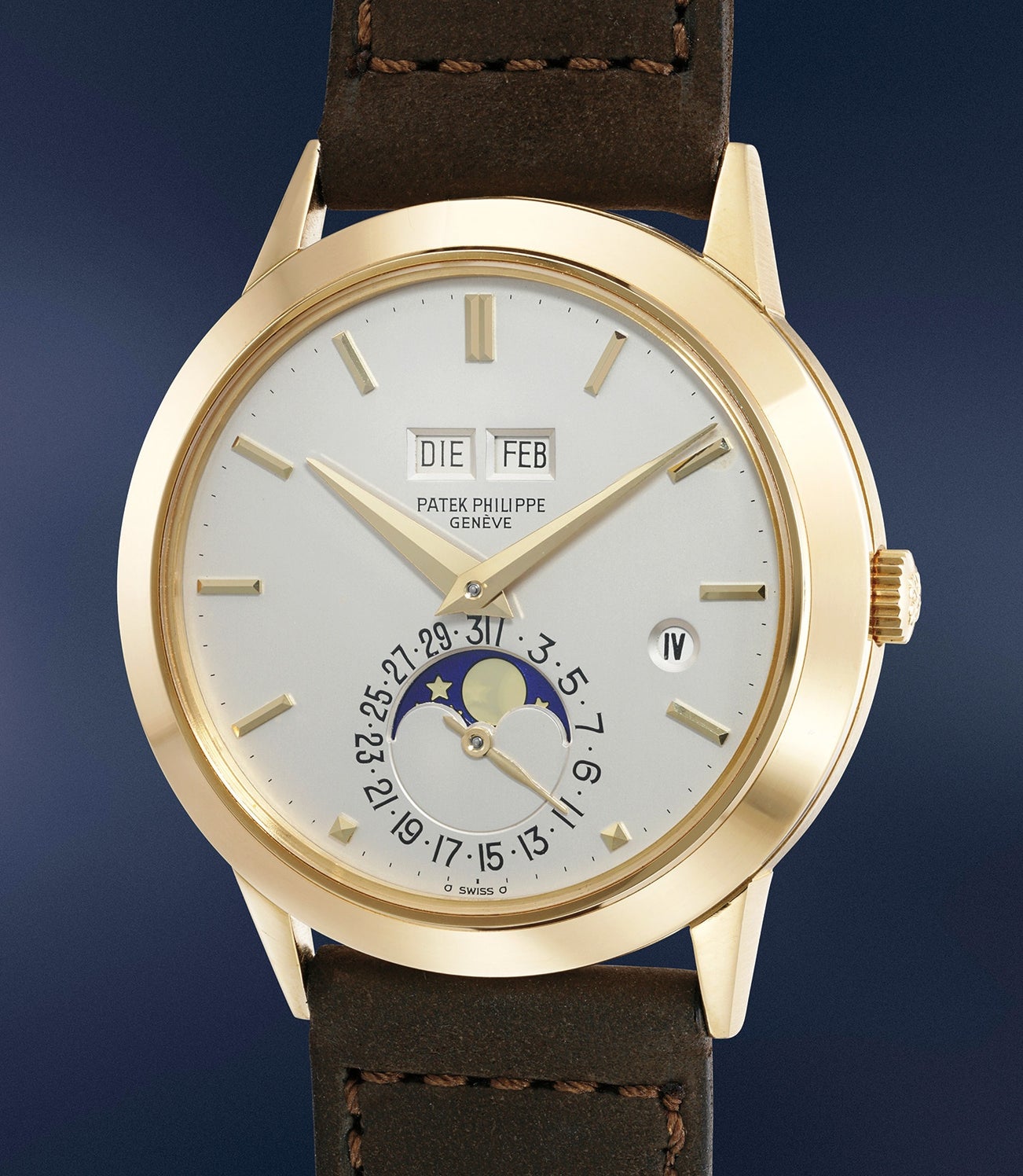 The present watch, manufactured in 1985, is among the very last examples of reference 3450s ever made before the introduction of reference 3940. While the first generation examples were fitted with a "red dot" to indicate the leap year, second generation examples displayed Roman numerals I, II, III and IV, like the present model.