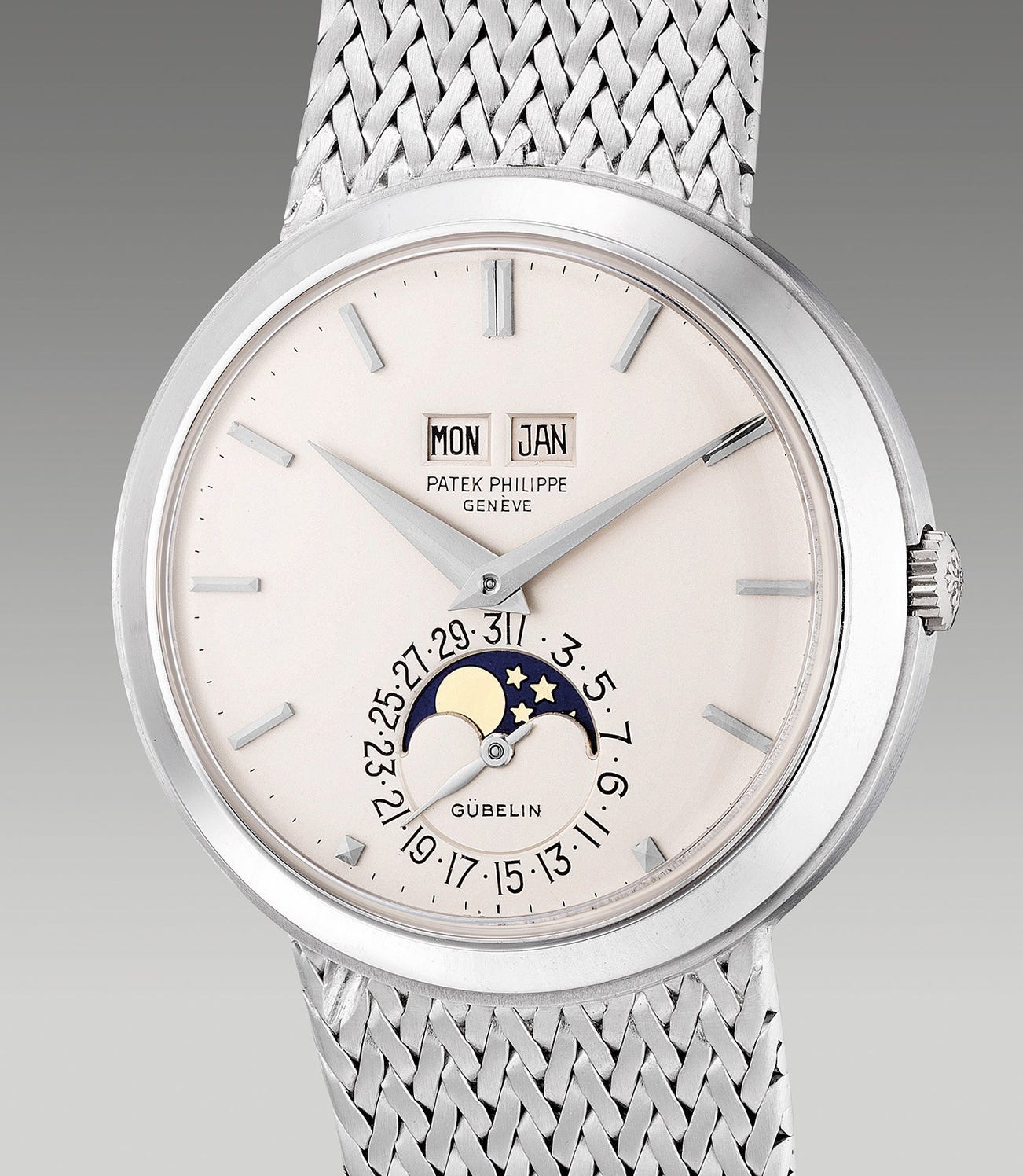 The present example belongs to a rare variant of the much appreciated reference. Encased in the rarer white gold case, the present example is further exemplified by an integrated bracelet without the usual pointed lugs. Believed as a special request from an important client of Patek Philippe, the client asked to incorporate an integrated bracelet normally seen in the ref. 3605/1 Ellipse Jumbo which makes this present example possibly unique. Furthermore, the present example is double-signed by Swiss retailer “Gübelin”, which takes the rarity of the present timepiece to a whole new level. Till today, the reference in white gold is only known with integrated bracelets -1, -2, -3, -6, -17 and -300, the present stamped with -14 is the first example to ever surface in the market. Featuring painted outer minute track instead of the pearl minute track seen in the earliest examples of the reference, the present example was produced after 1972 and confirmed by the Extract from the Archives with its date of manufacture in 1975. Presented in excellent overall condition and fresh to the market from the family of the original owner, the present 3448 in white gold is most certainly attractive. With a nice case retaining its sharp edges and a well-defined “step”, the case band still retains its hallmark as well as a nice blue enamel initials "ZS" on the caseback. Moreover, an Extract from the archives issued by Gübelin confirms the present example with an 18K white gold integrated bracelet in the style of the ref. 3605/1 as well as its blue enamel initials on the caseback in gothic style. To add to its importance and attraction, only 12 examples of the reference stamped with “Gübelin” is known only in yellow gold, it is the first time for a white gold example to appear in the market doubled signed “Gübelin”. This is a great opportunity for discerned collectors of Patek Philippe to acquire an important perpetual calendar wristwatch in a never seen before configuration coming from the family of the original owner.