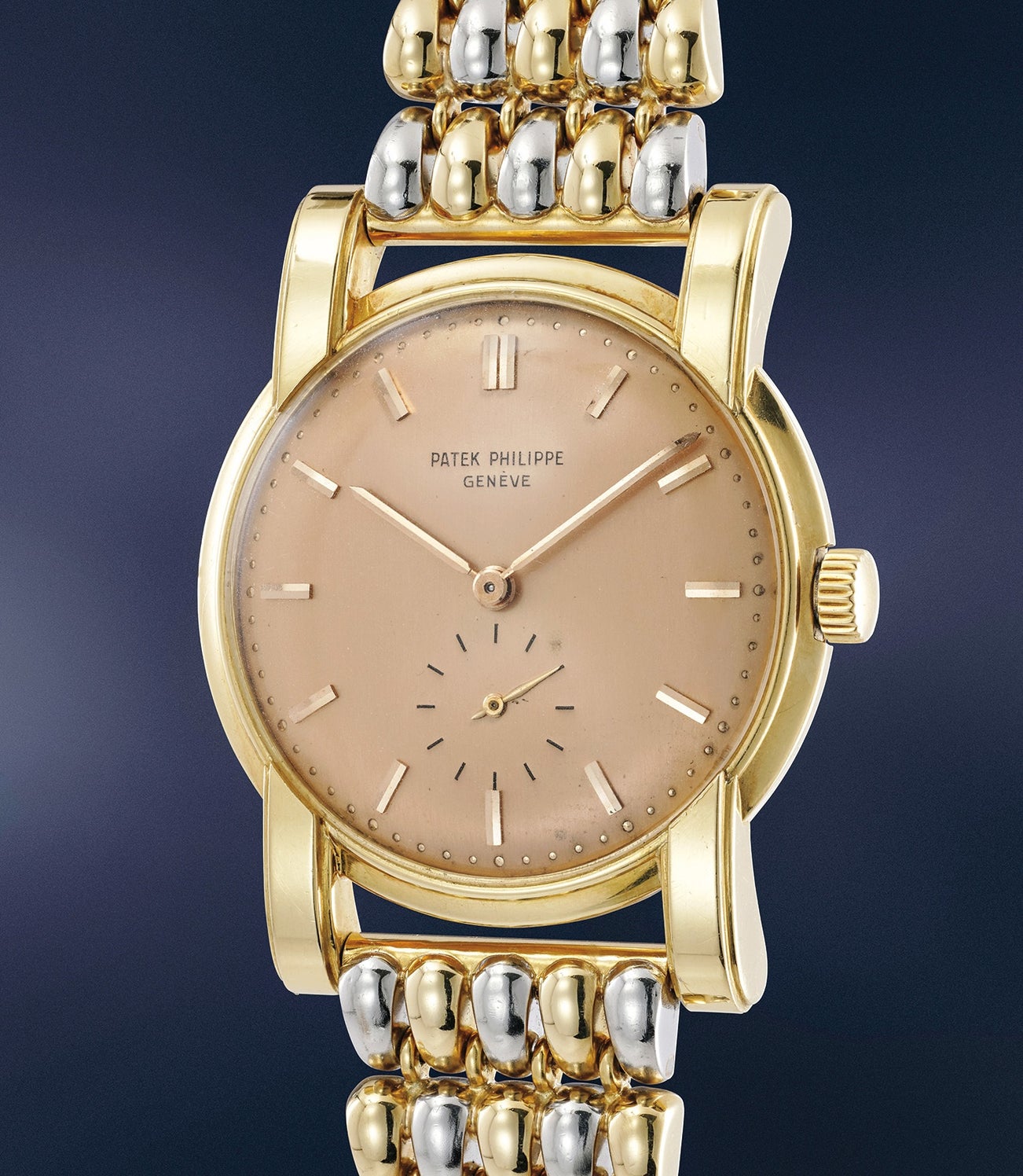 Most importantly, the present timepiece is accompanied by a lavish and heavy yellow gold and platinum rice grain bracelet which is confirmed in the Extract from the Archives, which is in itself a marvel. Incredibly imposing and arresting, this bi-colour bracelet is singular in appearance. According to research, this bracelet configuration has never appeared on any other Patek Philippe watch. This timepiece is also the only known reference 2428 with any confirmed bracelet, further adding to its unparalleled exclusivity and rarity.