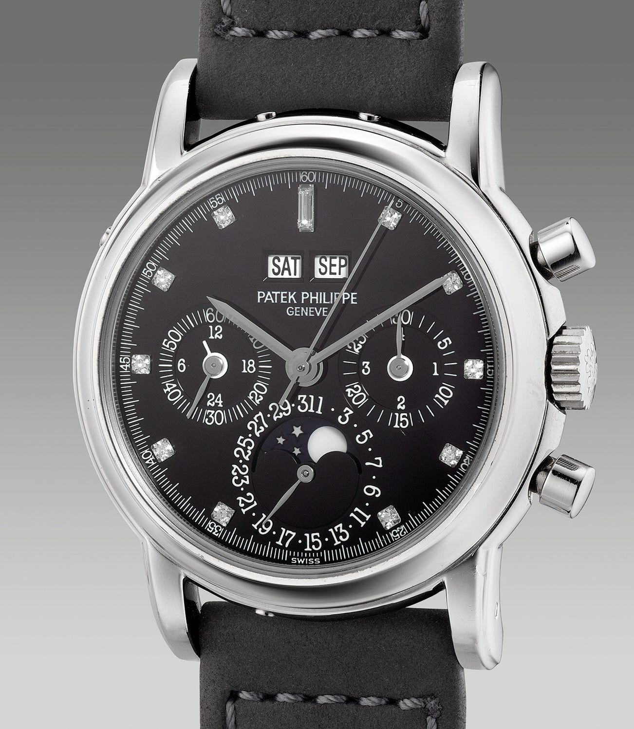 A fine and rare platinum perpetual calendar chronograph wristwatch with moon phases, 24-hour, leap year indication, diamond-set indexes and presentation box