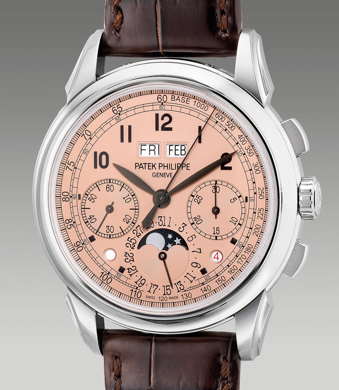 A highly attractive and important platinum perpetual calendar chronograph wristwatch with "salmon" dial, day and night indication, moonphases, leap year indication, additional case back, Certificate of Origin and fitted presentation box