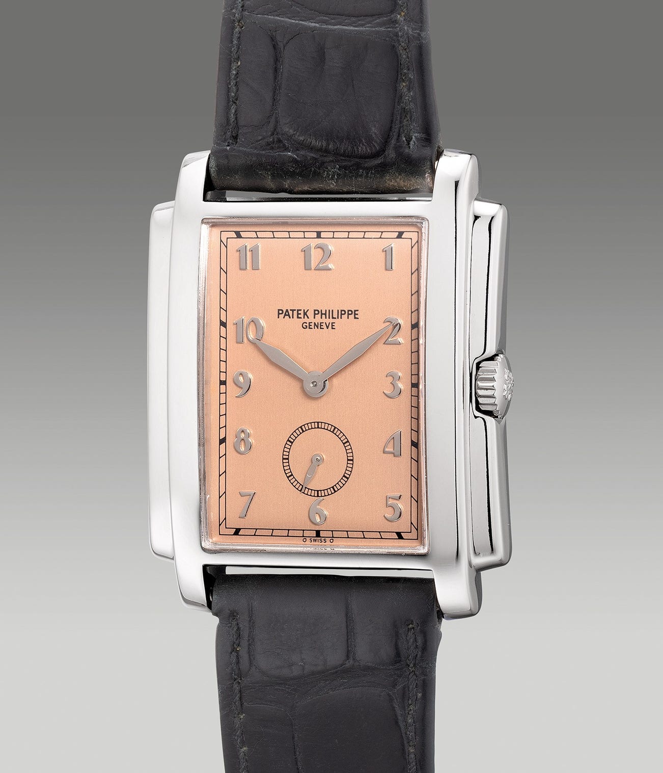 A fine and attractive white gold rectangular-shaped wristwatch with small seconds and "salmon" dial