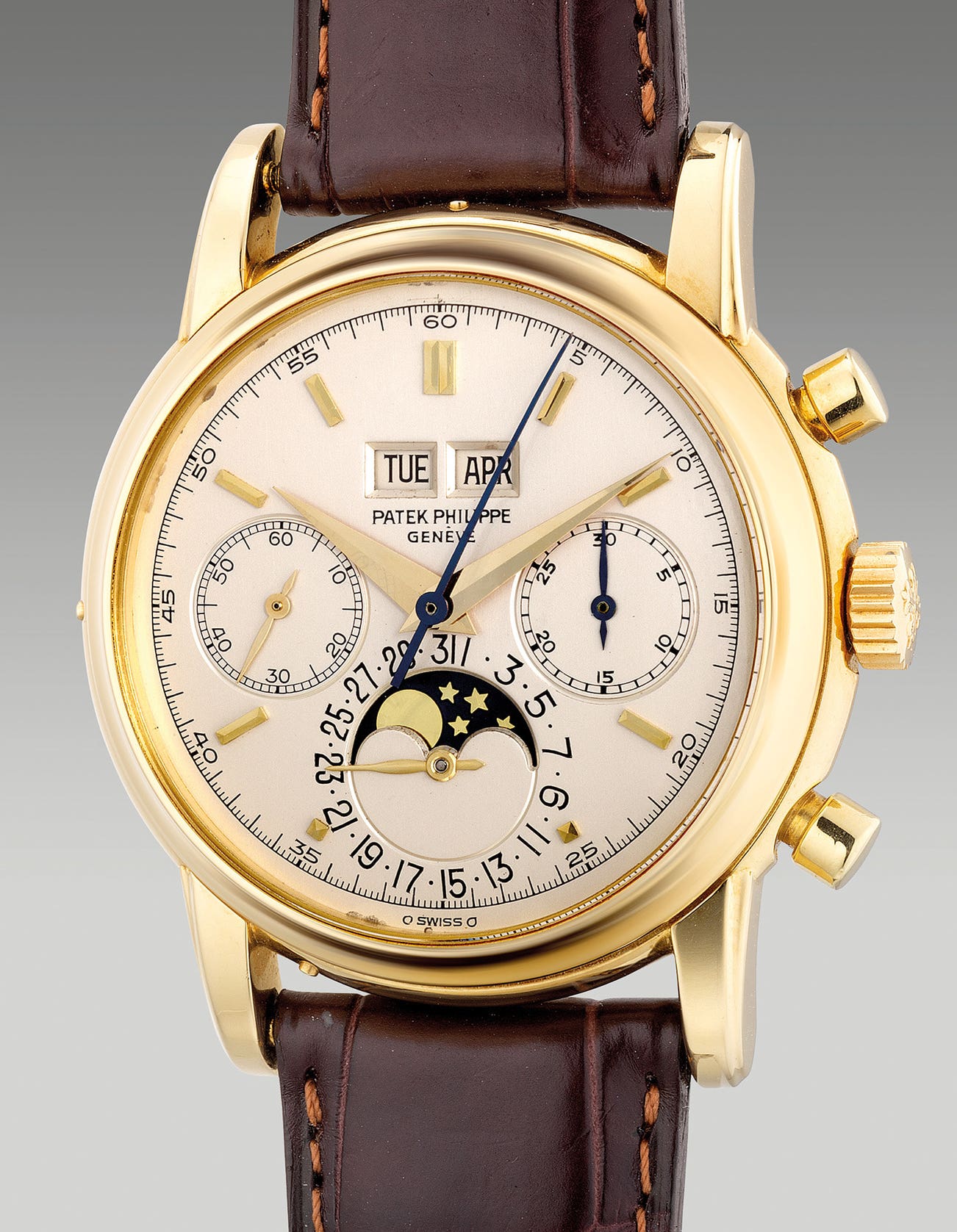 An extremely fine and rare yellow gold perpetual calendar chronograph wristwatch with moon phases