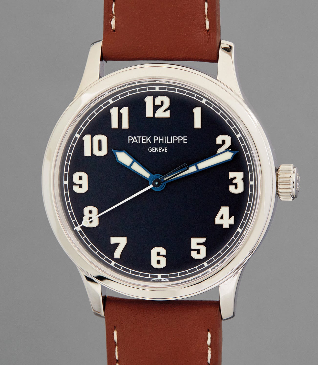 Referencing their past, and the iconic Calatrava wristwatch, first released in 1932, the Calatrava Pilot was named for its 1930s vibe and vintage aviators-style dial aesthetic. The blue lacquer dial, similar to the reference 5524G Pilot’s Travel watch released in 2015, features applied 18-karat white gold Arabic, and blued steel hand with luminous coating. The 42mm diameter case has a sapphire crystal back engraved “Patek Philippe New York 2017”, through which the automatic caliber 324 SC can be seen. The watch has a timeless and masculine appeal making it a perfect everyday timepiece.