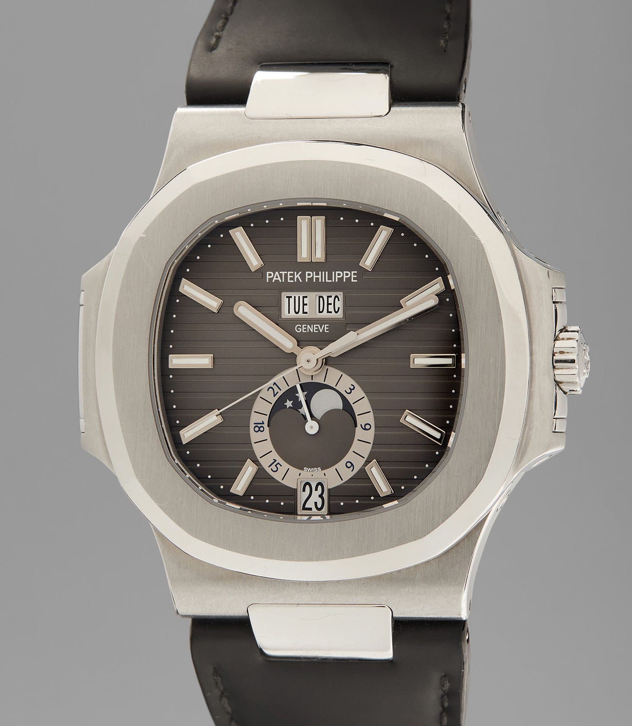 The present example is offered at auction by the original owner, and housed in the immediately recognizable case designed by Gerald Genta with a 40.5 millimeter diameter. Its condition is superb - hardly ever-worn, and complete with box, certificate and accessories. The reference 5726 is a wonderful marriage of sportive luxury and high complication – certain to excite the discerning collector.