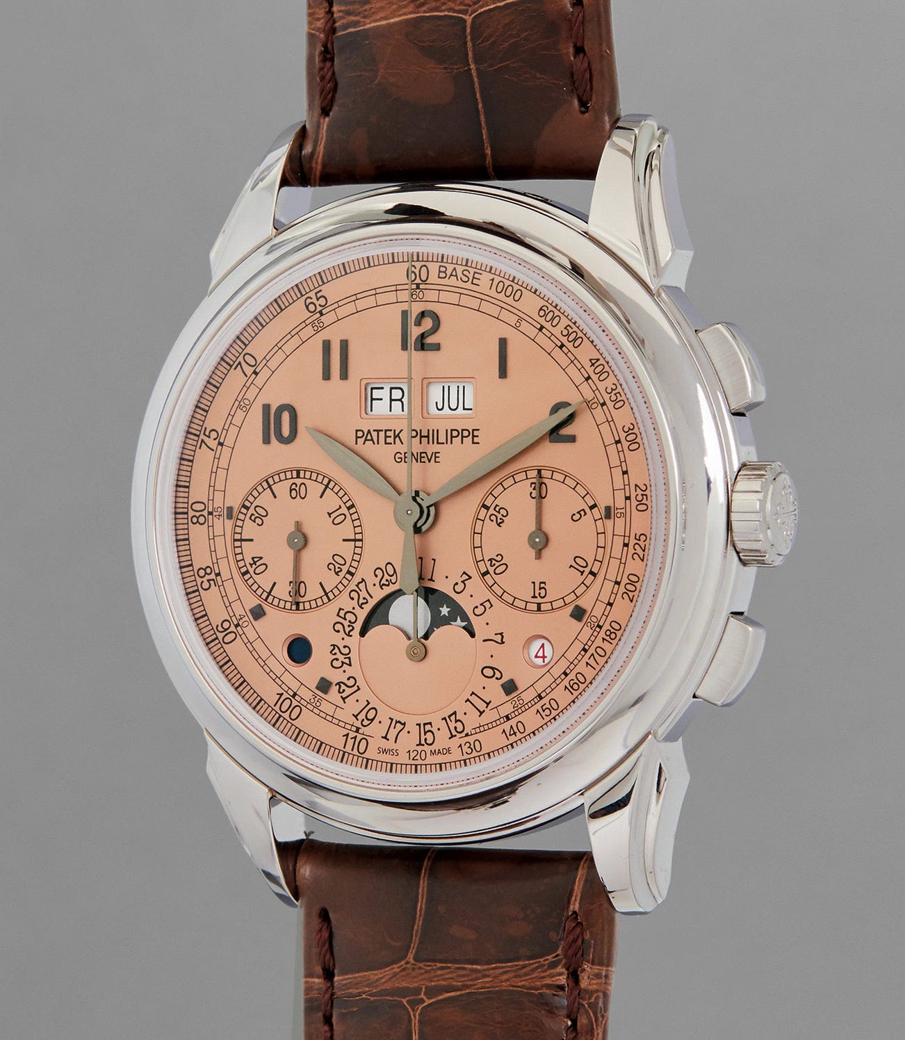 The present reference 5270P was the brand’s latest iteration when launched in 2018, available for the first time in platinum. Highly sought after by collectors for its stunning aesthetics, it is fitted with an elegant "salmon" pink dial with blackened gold applied baton numerals that are both striking and balanced. It is offered in nearly new condition, with its full suite of original accessories.