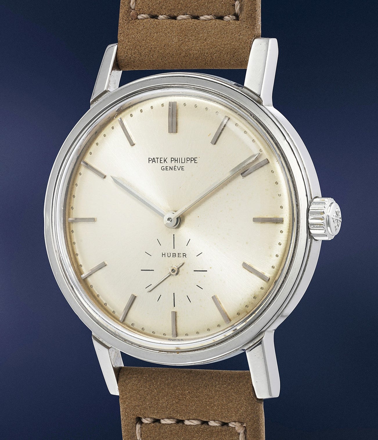 Preserved in excellent condition, the stainless steel case is preserved in excellent condition, displaying bold proportions. Furthermore, the watch features a charismatic silvered dial that has turned an even and strong ivory tone. As an even nicer touch, the dial display the signature of Huber, the famed watch retailer in Liechtenstein. To date, the present watch is the only known reference 3644 to bear the signature of Huber. In addition, the back of the lug is engraved with what is most likely the inventory number of the retailer.