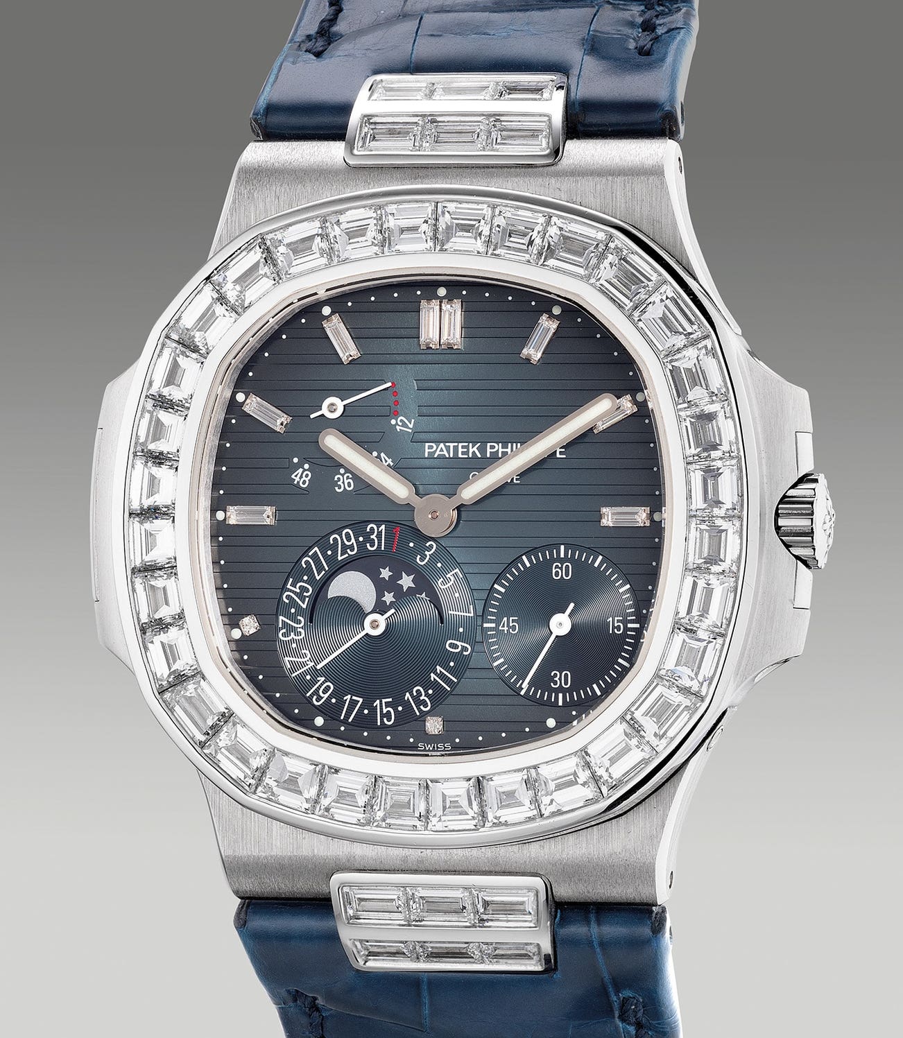 Initially launched in stainless steel with an integrated bracelet and a variant in white gold with a leather strap, the model was also available with baguette diamond-set examples in white gold and pink gold via the refs. 5722G, 5722R, 5724G and 5724R. All four references featured a baguette diamond-setting on the case with ref. 5722 only bearing a diamond-set bezel and the ref. 5724 with a diamond-set bezel and lugs. Providing a glamorous appeal to the 5712, the ref. 5724G is perfect for an important black tie event while the 5712A is a perfect timepiece for daily wear, both most importantly featuring the same complications.