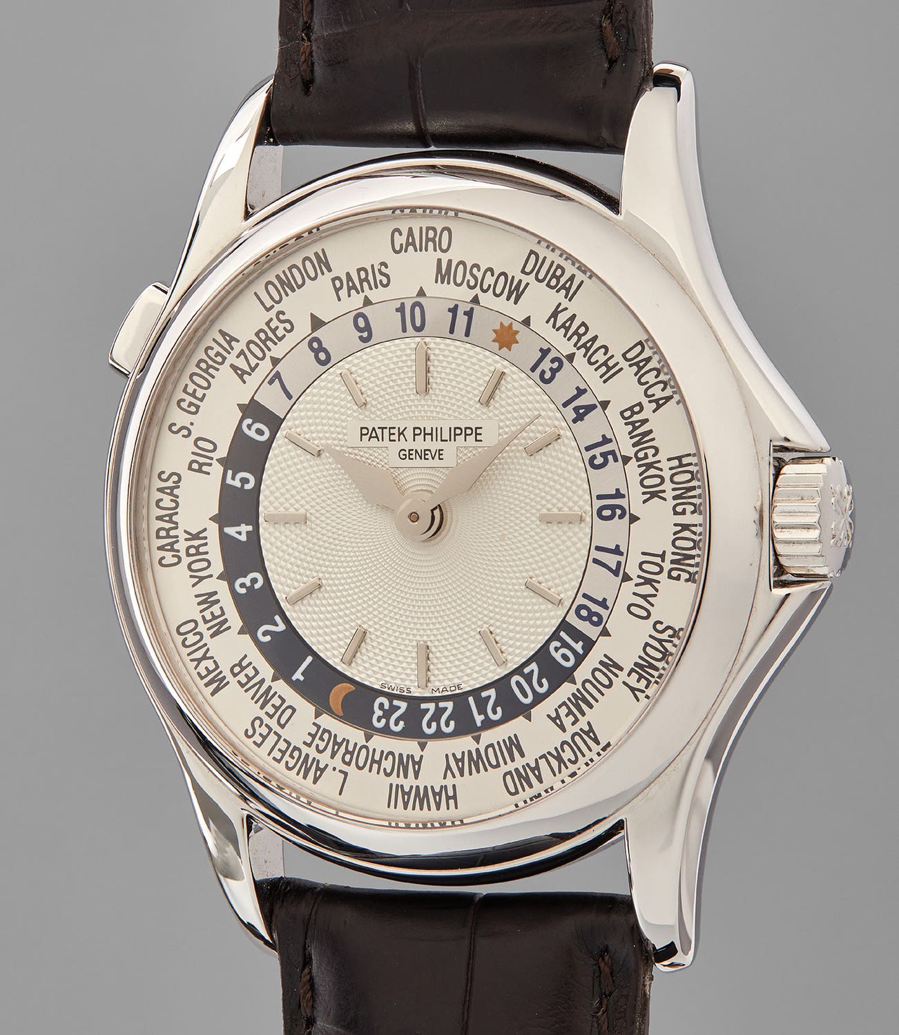 Fifty years passed between the first serially-produced world-time wristwatch produced by Patek Philippe, the vaunted reference 2523, and the next iteration, the reference 5110 released in 2000. Available in every metal except for steel, it combines the gentle curves and bold elegance of the classic Calatrava case with Louis Cottier’s ingenious world time invention, as well as a beautiful guilloche center disc. An absolute classic, it boasts a 24-hour dial divided into daylight and nighttime hours, with the names of cities and islands in each time zone around the edge of the dial. A pusher on the top left side of the case advances the location disc, allowing the wearer to set a “home” time zone while simultaneously viewing the time in any of the other cities.
