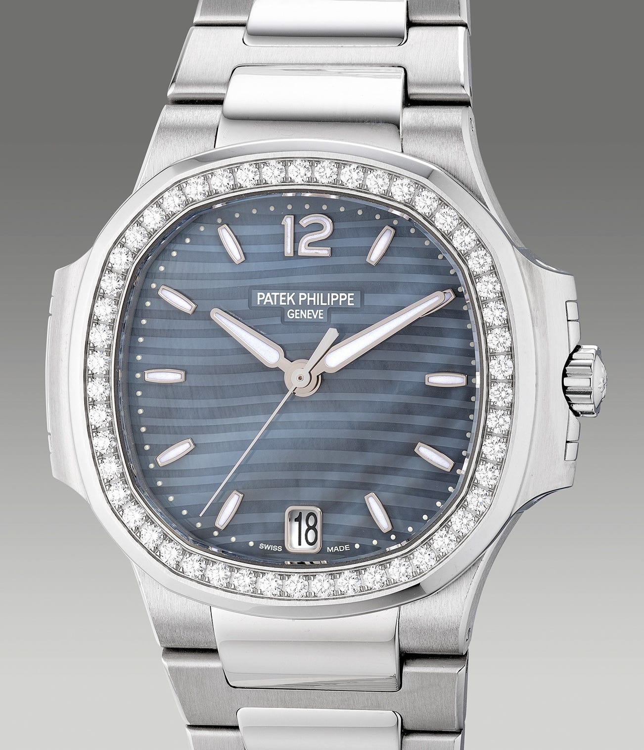 In 2006, the firm launched their contemporary collection of the Nautilus. In 2009, the first contemporary ladies Nautilus model was released via the ref. 7011/1 and 7010/1. In 2013, Patek Philippe introduced the ref. 7018/1A in stainless steel with a diamond-set bezel with an attractive blue mother of pearl dial.