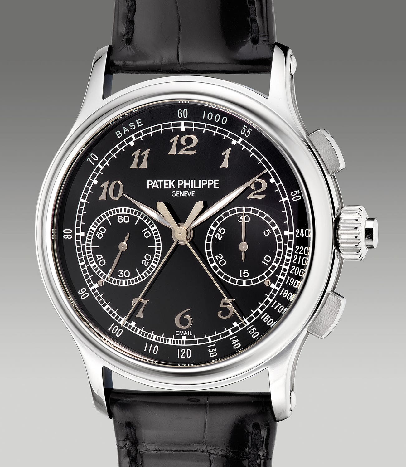 A superlative and rare platinum split seconds chronograph wristwatch with black enamel dial, Certificate of Origin and presentation box