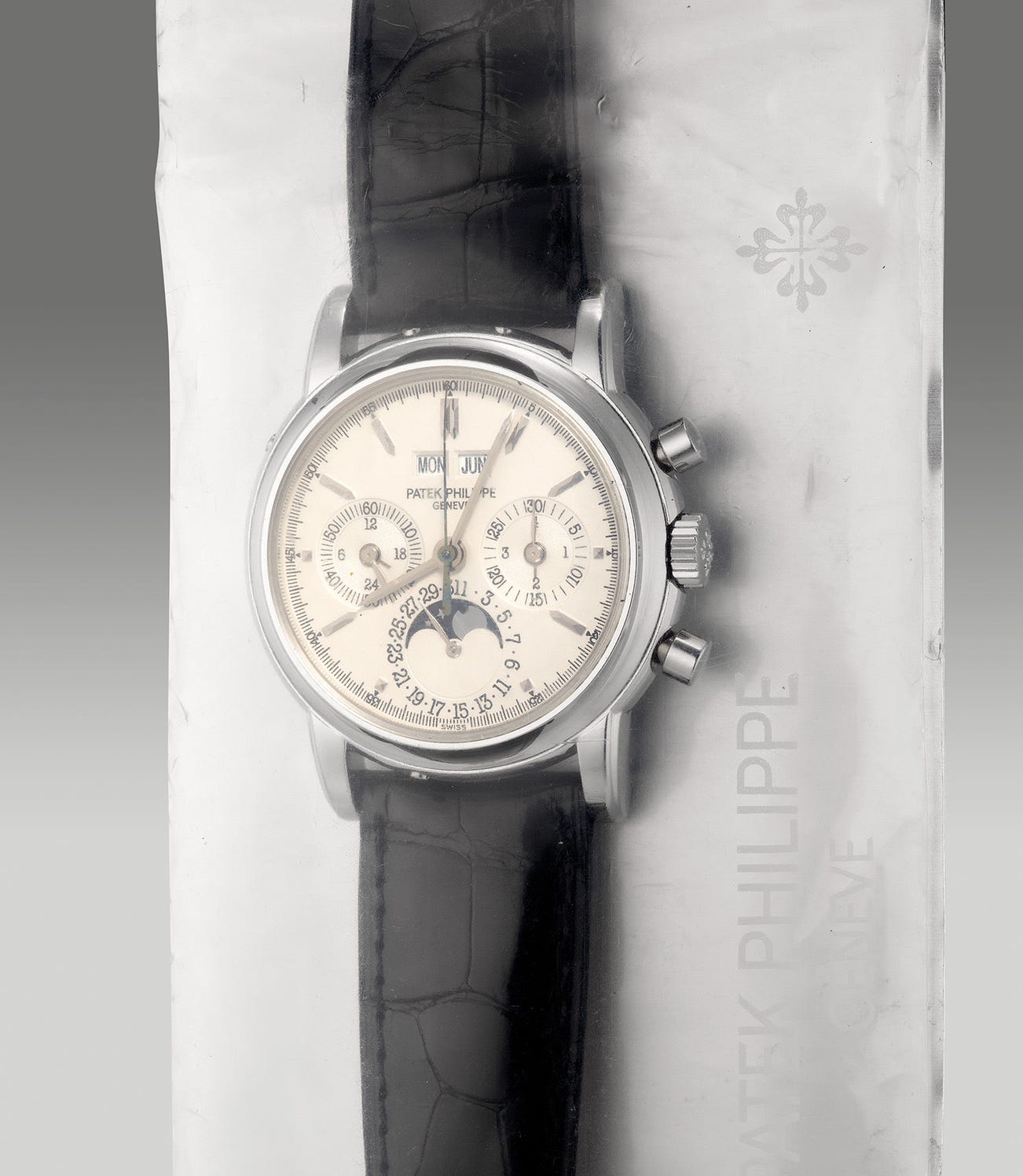 A very fine and rare platinum perpetual calendar chronograph wristwatch with moon phases, 24-hour, leap year indication, additional solid caseback, Certificate of Origin and presentation box, single sealed