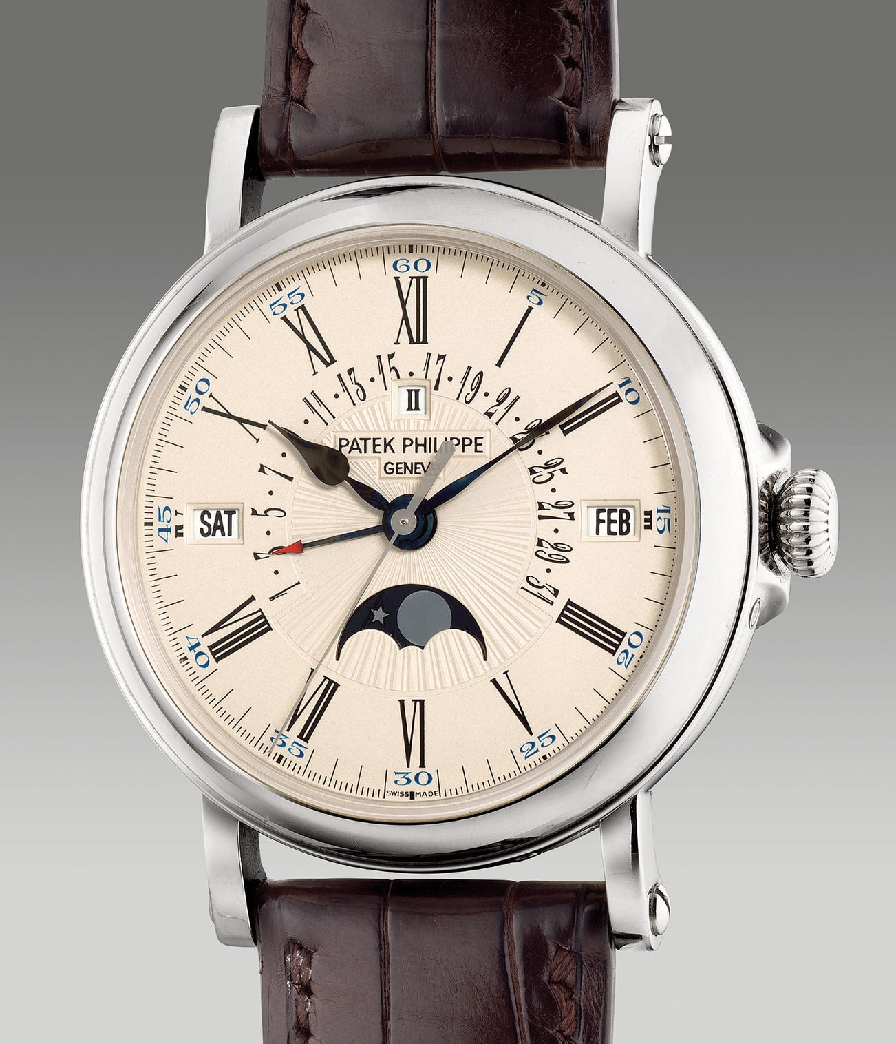 A fine and attractive white gold perpetual calendar wristwatch with moon phases, retrograde dates, leap year indication, Certificate of Origin and presentation box